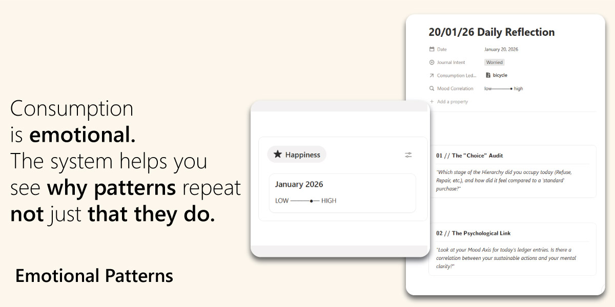 Consumption is emotional. This system integrates mood and mental state tracking so patterns emerge naturally, helping you understand why certain choices repeat, not just what you buy.