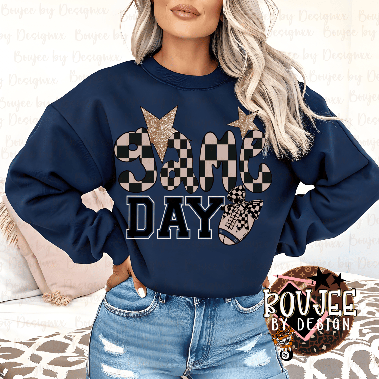 Game Day SVG + PNG | Retro Checkerboard Football Design with Glitter Stars & Bow