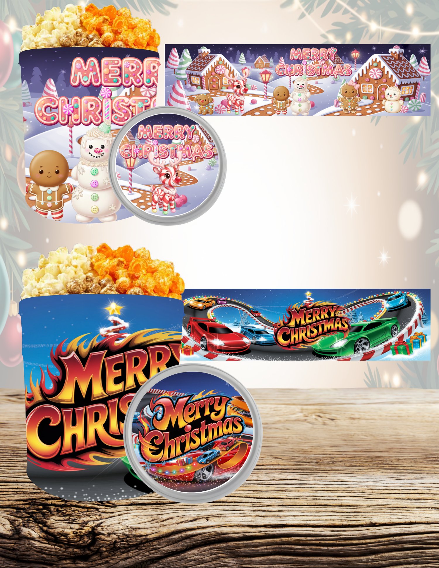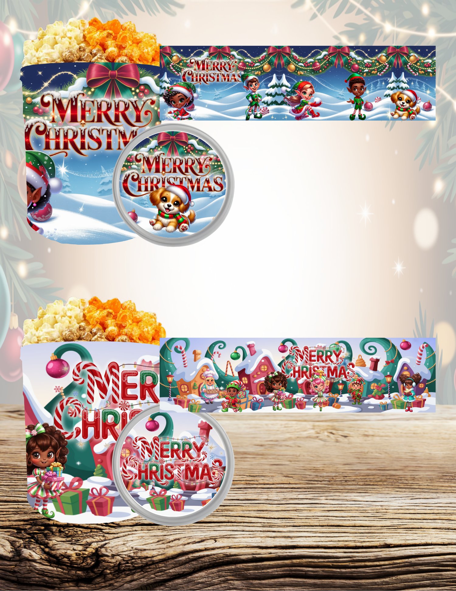 You’ll receive 6 popcorn tin wraps in a Christmas theme: