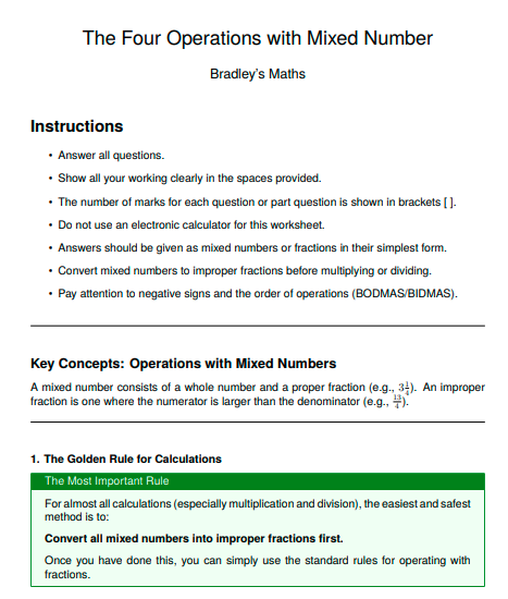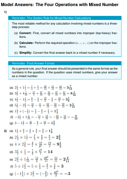 IGCSE Higher Maths: The Four Operations with Mixed Number (Worksheet & Model Answers)