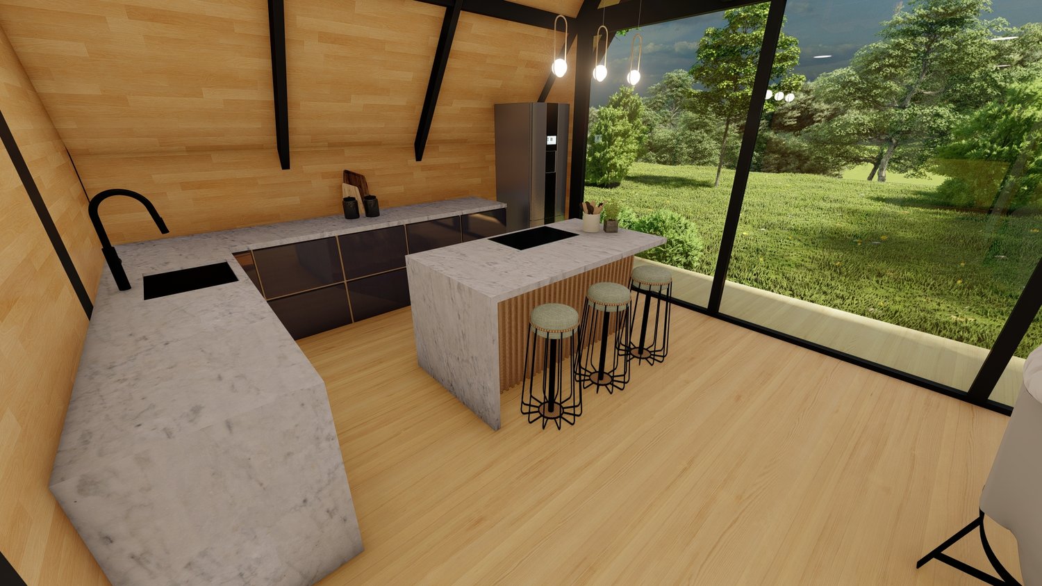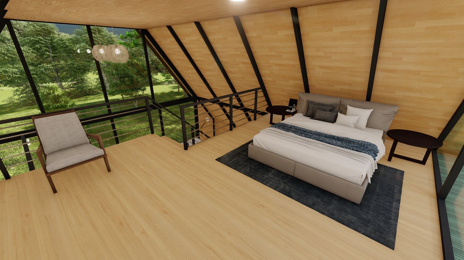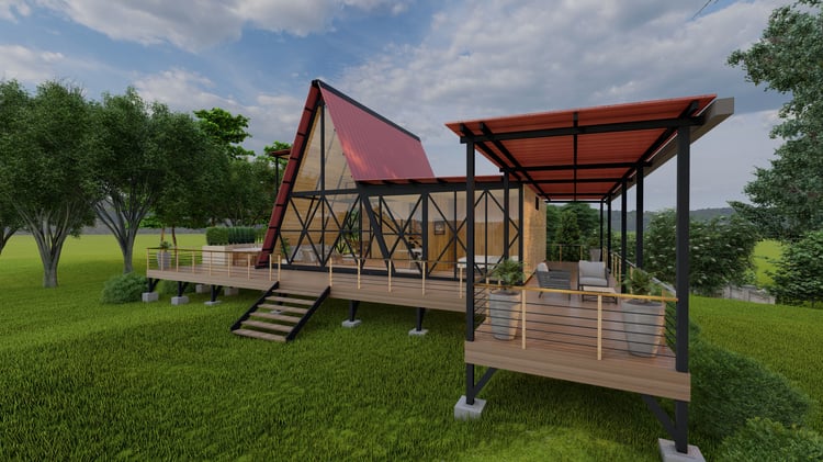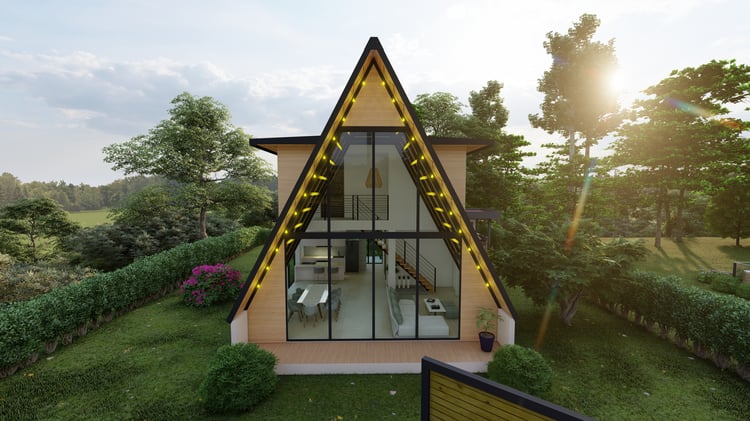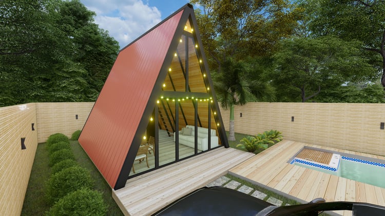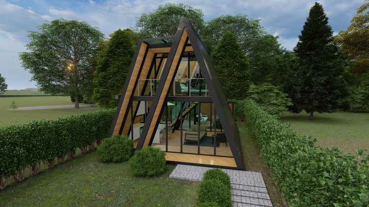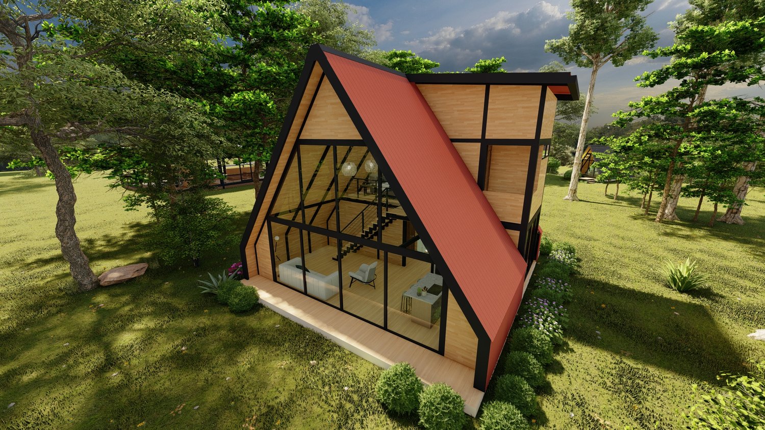 Un diseño arquitectónico moderno, elegante y muy atractivo que destaca por su gran fachada en vidrio y estructura tipo A-Frame.