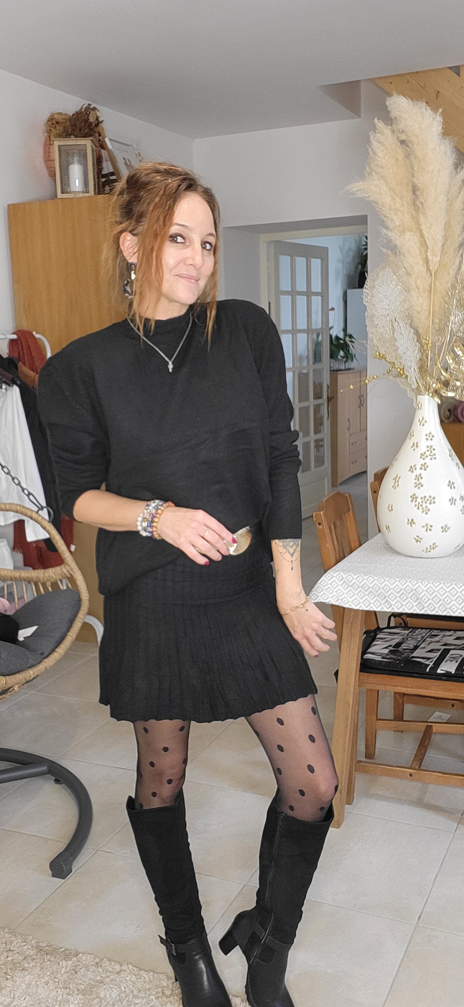 La jupe plissée apporte une touche féminine et fluide, tandis que le pull loose équilibre la silhouette avec style et confort.