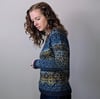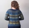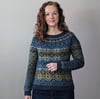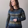 Hypnotic is knit from the top down in the round. The collar is cast on first, with short rows used to shape the neckline. The colourwork chart is established and carries through to the underarm. The stranded chart is constant around the yoke throughout the increase section. Once the desired number of yoke stitches has been achieved, the sweater is divided so that the centres of the front and back are worked in a different motif than the sides of the sweater. Once complete, the yoke is divided into sleeve and front and back stitches, with the sleeve stitches put on hold. Underarm stitches are cast on, and the body continues in the round in the colourwork pattern to the hem. The sleeves are taken off of hold, and worked from the top down in the same pattern as the side chart.