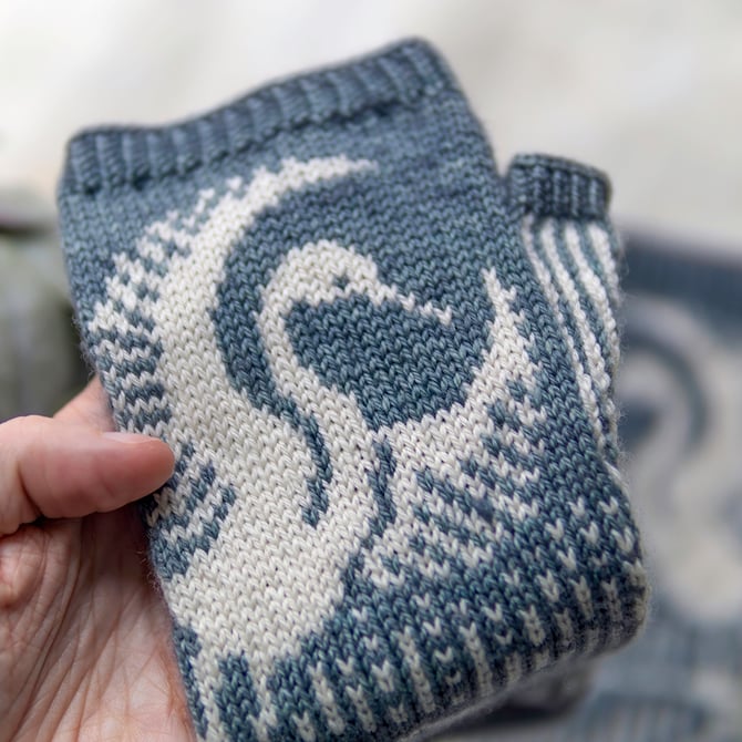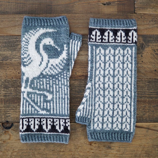Thula Mitts feature the Snowy Egret (scientific name Egretta thula) landing in marsh grass. Elegant and vivacious, these members of the heron family are social birds, often noted for their dramatic foraging and territorial displays. The design features a wide figurative panel on the back of each mitt, which wraps around to meet a narrower panel with a repeated motif on the palm side, as well as a feather-inspired border at the bottom. The pattern is recommended for knitters who have experience with stranded colorwork, reading from charts, and knitting in the round. The sample shown above was knit in Magpie Fibers Swanky Sock yarn (80% Superwash Merino, 10% Cashmere and 10% Nylon).