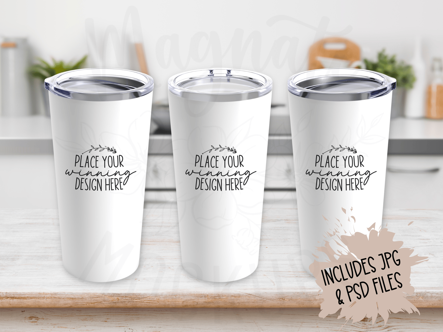 A 20oz tumbler mockup featuring 3 angles for your winning design! I have also provided an instructional step by step guide and video for you, incase this is your first time learning to place your design onto a psd style mockup.