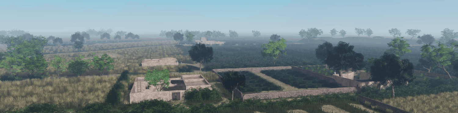 A highly detailed Afghan rural combat environment inspired by the Sangin District in Helmand Province, featuring mud-brick compounds, irrigation canals, agricultural fields, and military encampments. Designed for immersive modern warfare, counterinsurgency operations, and long-form milsim or roleplay deployments.