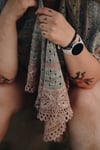 The shawl begins at the center and is worked outwards to border. There are two yarn-over increases in every row which create a long banana-like shape. The shawl is worked in Stockinette stitch with eyelets, which resemble raindrops, interrupted by Garter stripes. The lacy cabled border is worked sideways at the end and attached to the body by means of simple decreases and slipped stitches.