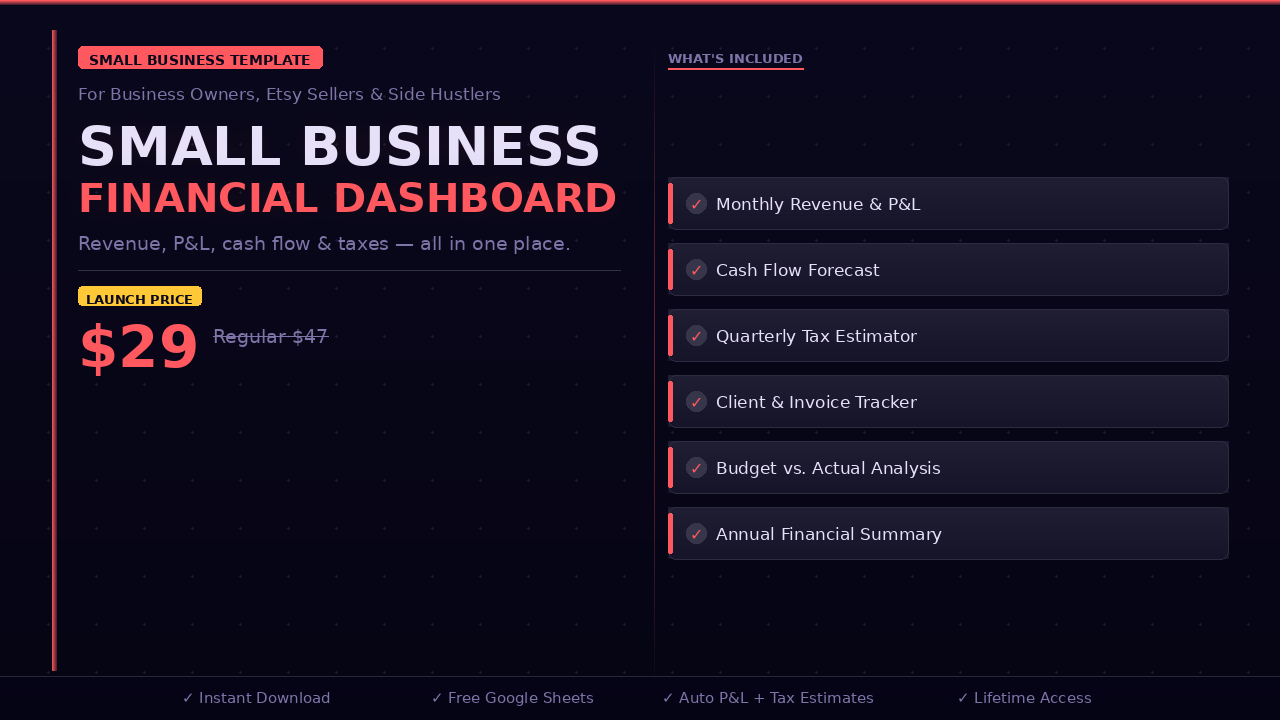 No accounting degree. No expensive software. No ongoing subscription. Built for Etsy sellers, freelancers, coaches, and every small business owner who's tired of not knowing their real numbers.