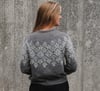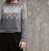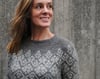 This garment is worked top-down, in the round. After the neckband, short row shaping is incorporated to optimise fit. The majority of the yoke features a stranded colourwork pattern. Once the yoke is completed, stitches are separated into body and sleeves, which are each worked separately and in the round. The stranded colourwork pattern is worked into the upper body and sleeves, after which each are worked in stockinette to the waistband and cuffs. Before working the cuffs, a small section of stranded colourwork is added to each sleeve.