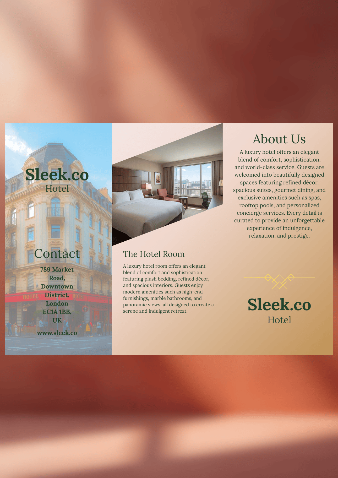 - Trifold Brochure Design – Showcase your rooms, amenities, and services in a polished, easy-to-navigate format.