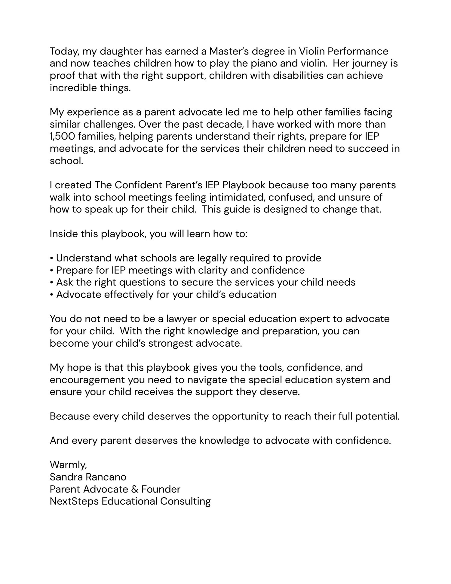 Written by Sandra Rancano, a Special Education Advocate who has supported more than 1,500 families and attended over 250 IEP meetings, this guide simplifies the complex world of special education so parents can effectively advocate for their children.
