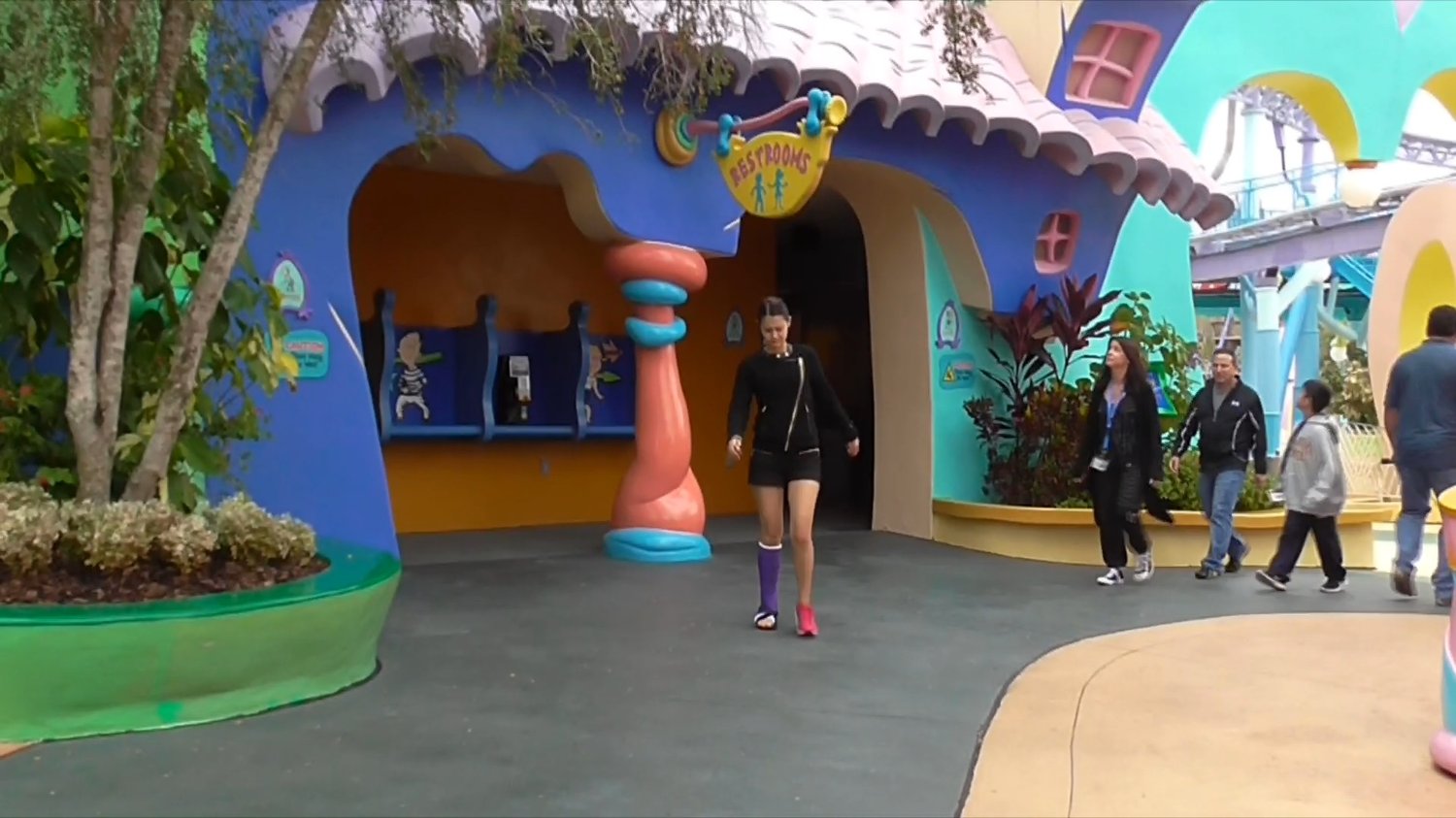 Elisabeth is today visiting Universal Studios in Orlando.She walk around with a cast shoe on her purple SLC.We see her hopping on one leg down the steps to the lake and when she is going up on some other steps she jumps up for this to.