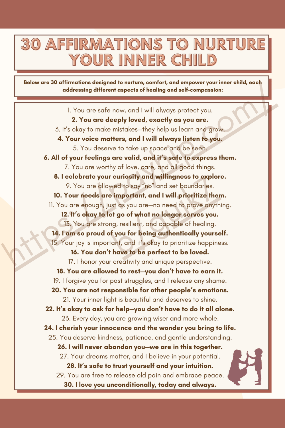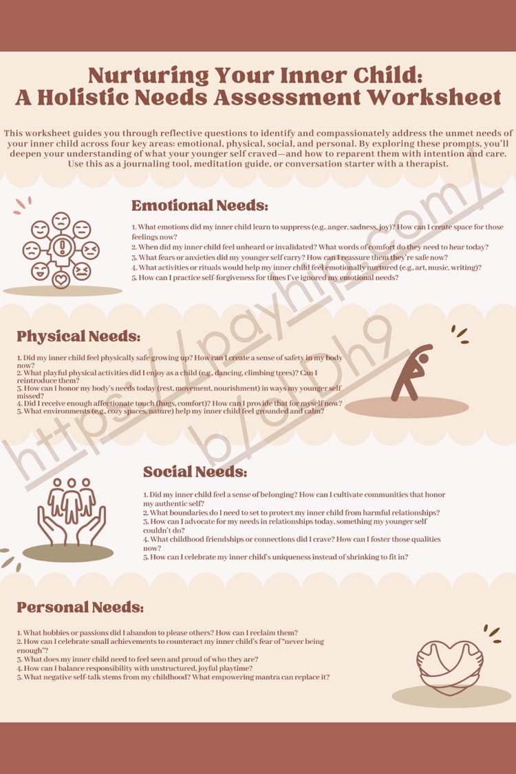 This worksheet offers 30 affirmations designed to nurture, comfort, and empower your inner child, each addressing different aspects of healing and self-compassion.