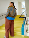This boxy sweater is an interesting slip-stitch pattern where you can play with the stripes’ colours. It is knitted in fingering-weight yarn and a generous positive ease. The enchanting stitch pattern is easy to memorise and fun to work.