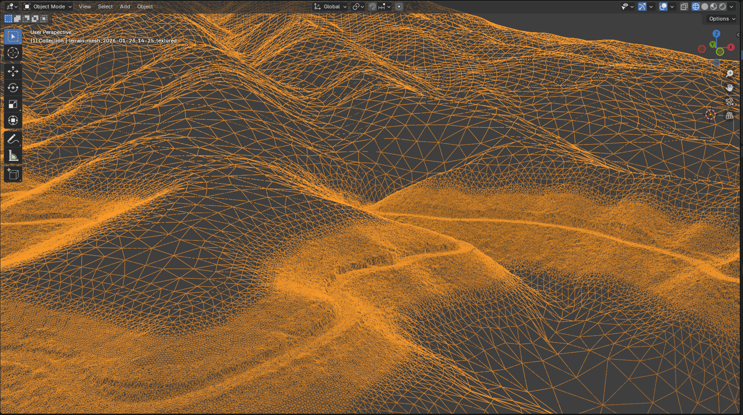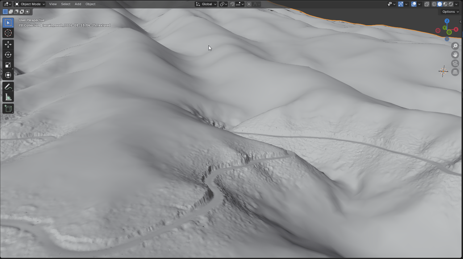 - Proximity-based meshing: generate terrain meshes in minutes, with geometry density optimized based on distance from the track.