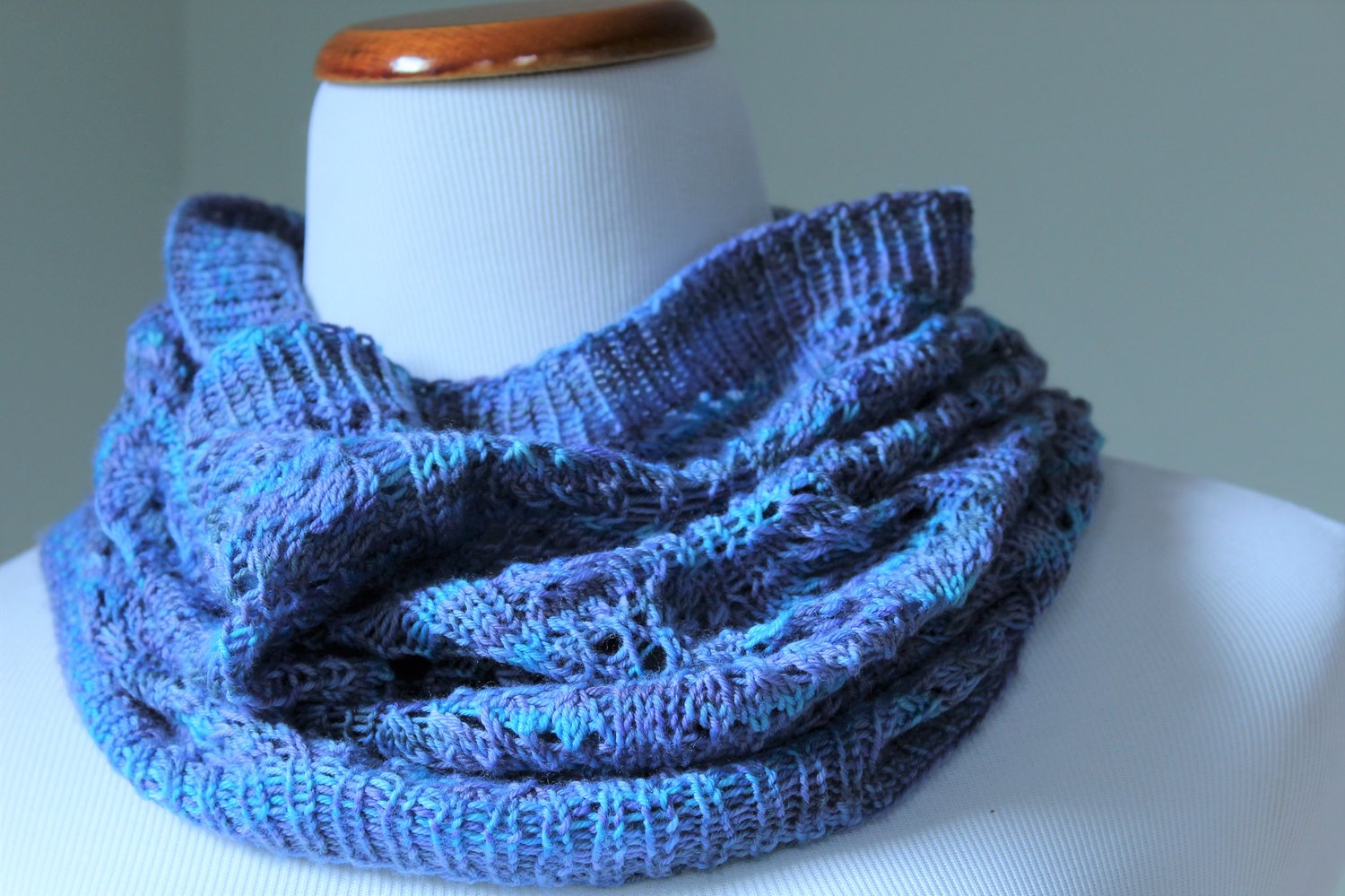 I am always drawn to the wonderful ways water flows—in this case with force, straight up. This cowl pushes those waterspouts up and around the neck with a fabric that results in a delightfully soft puddle of possibility. Lace cowls blend warmth and fun together, like a shawl but with less fussiness of ends.