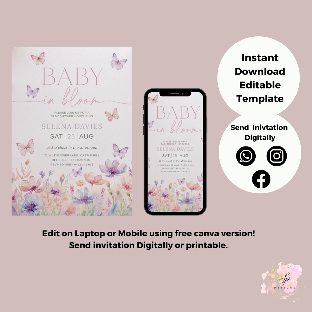 Baby in Bloom Invitation, Wildflowers Baby Shower Invitation, Purple Pink Flower Invitation, Wild Flower Invite, Floral Invite Butterflies