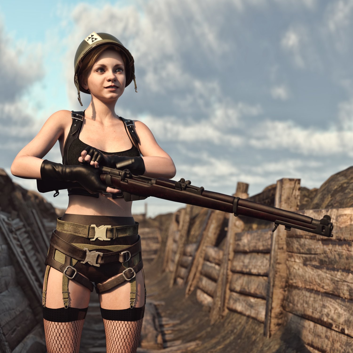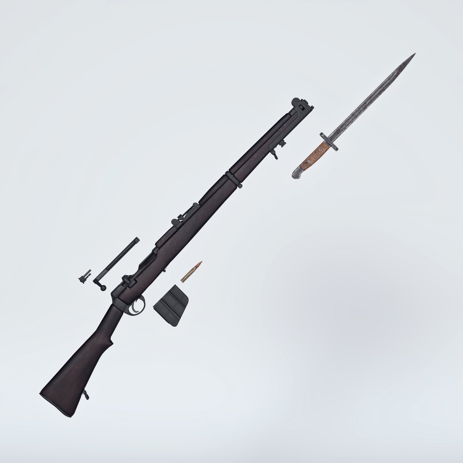 A great WW2 rifle for Great Britain forces. While most rifles of that time held 5 rounds, Enfield rifles held 10 in the same form factor, which gave a big advantage. Had loads of modifications. This one is shorter, and also includes a bayonet. The prop is rigged and converted for use with DAZ. Trigger, bayonet, bolt etc also rigged for more realistic pictures.
