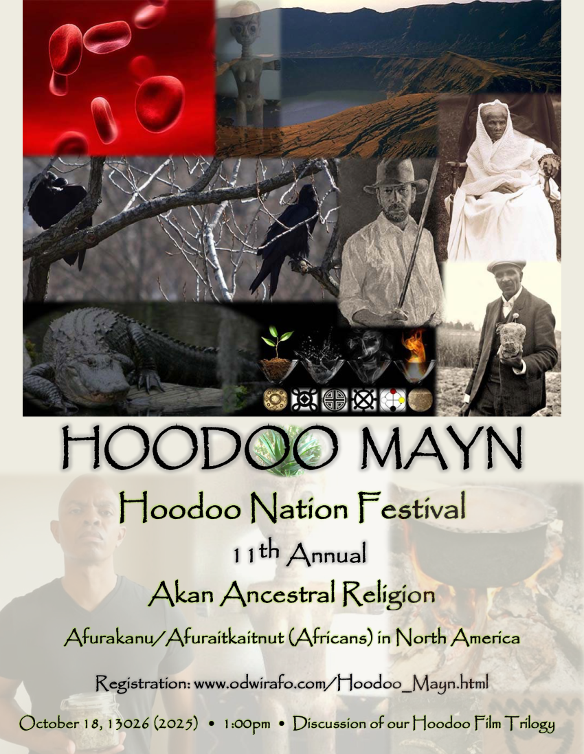Aakhuamuman Amaruka Atifi Mu, the Akwamu Nation in North America, welcomed the Afurakani/Afuraitkaitnit (African~Black) community to our eleventh annual HOODOO MAYN - Hoodoo Nation Festival which takes place on October 18, 13026 (2025). Our focus is restoring the consciousness of Akan Ancestral Identity as Hoodoo in family blood-circles, culture and ritual preserved in North america for centuries. Nationbuilding/Restoration is rooted in this, our spiri-genetic inheritance.