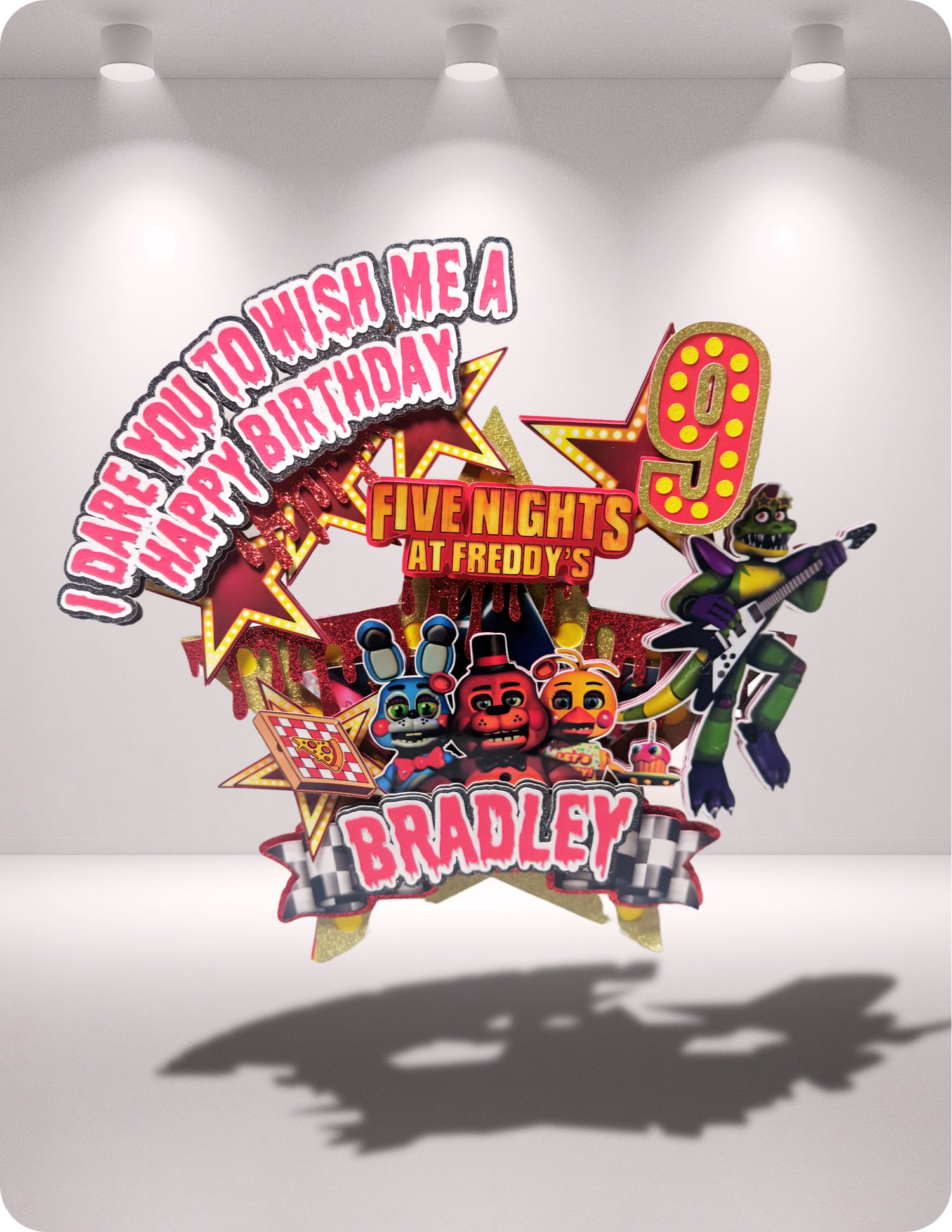 Bring your child’s favorite game to life with this custom Five Nights at Freddy’s cake topper! Designed with layered cardstock, shimmering glitter stars, and personalized details, this topper adds the perfect finishing touch to any themed birthday celebration.