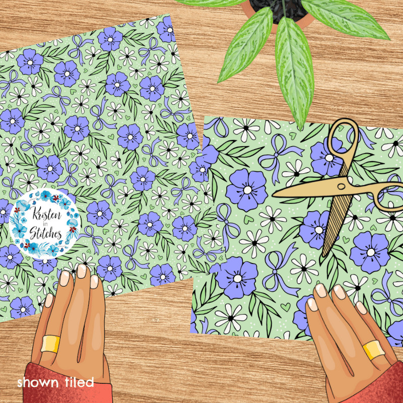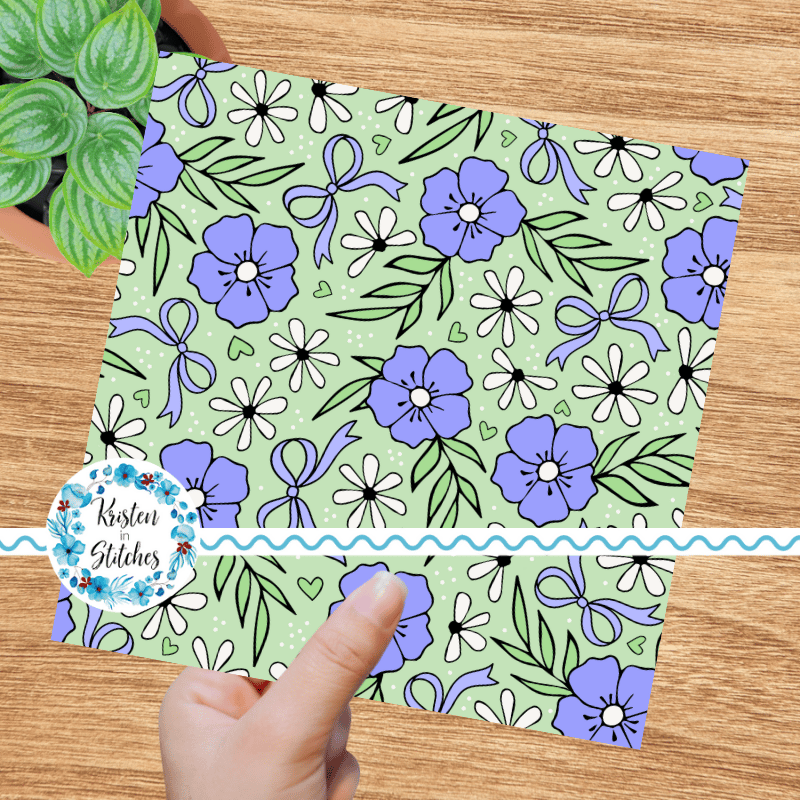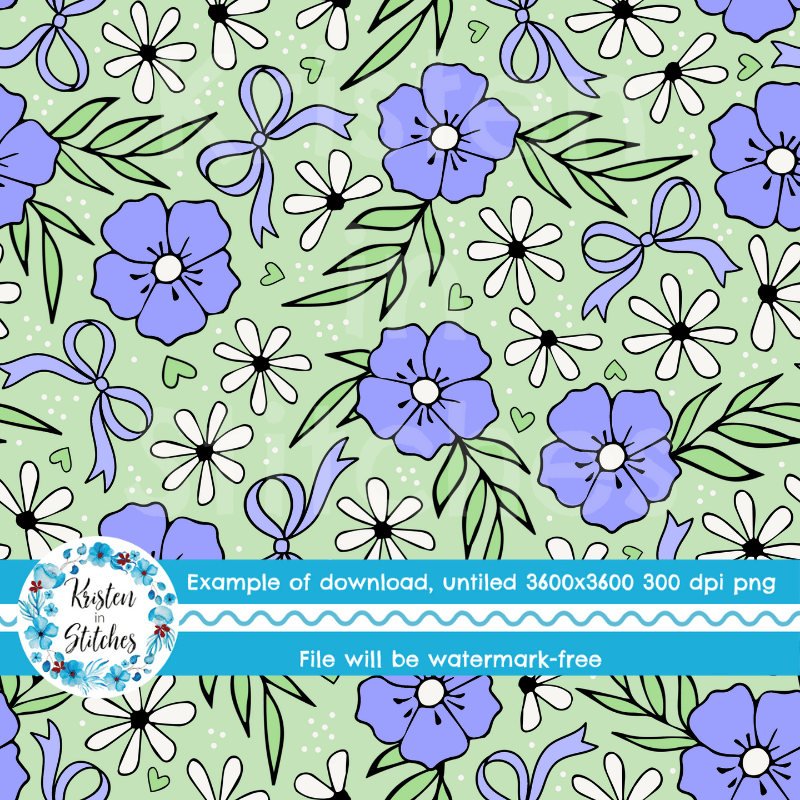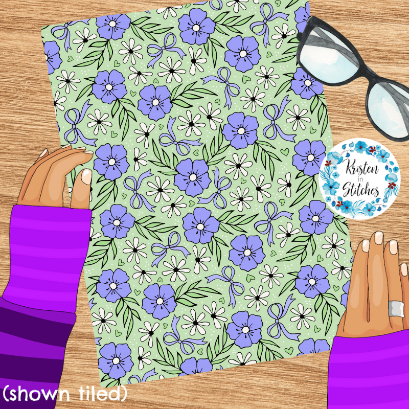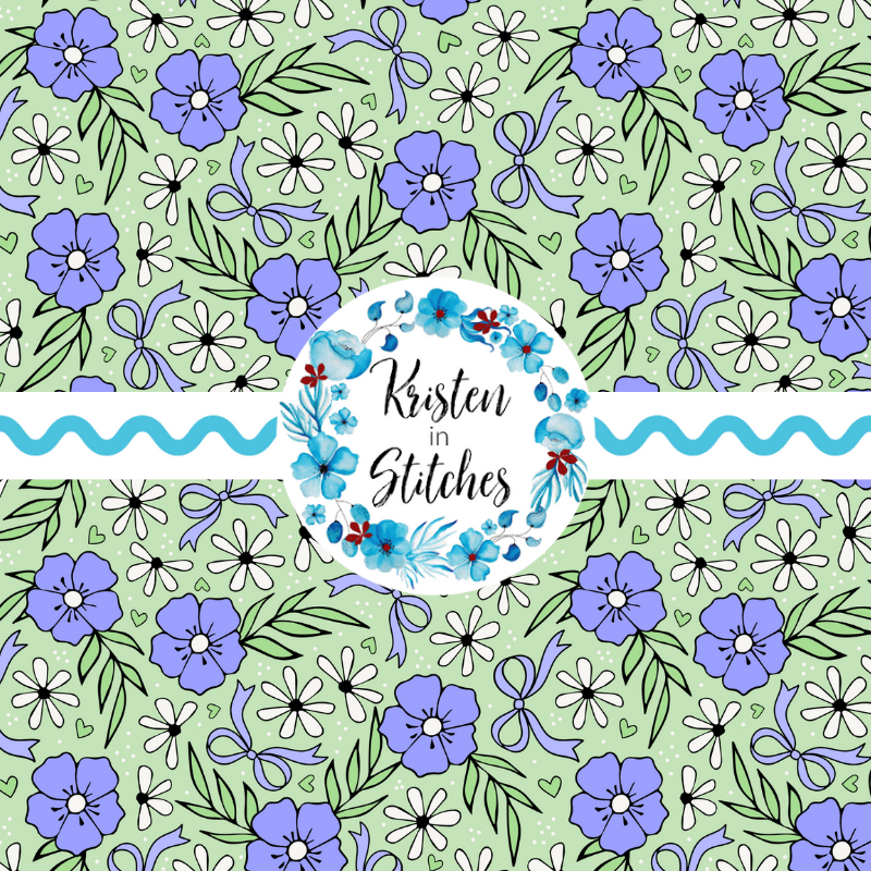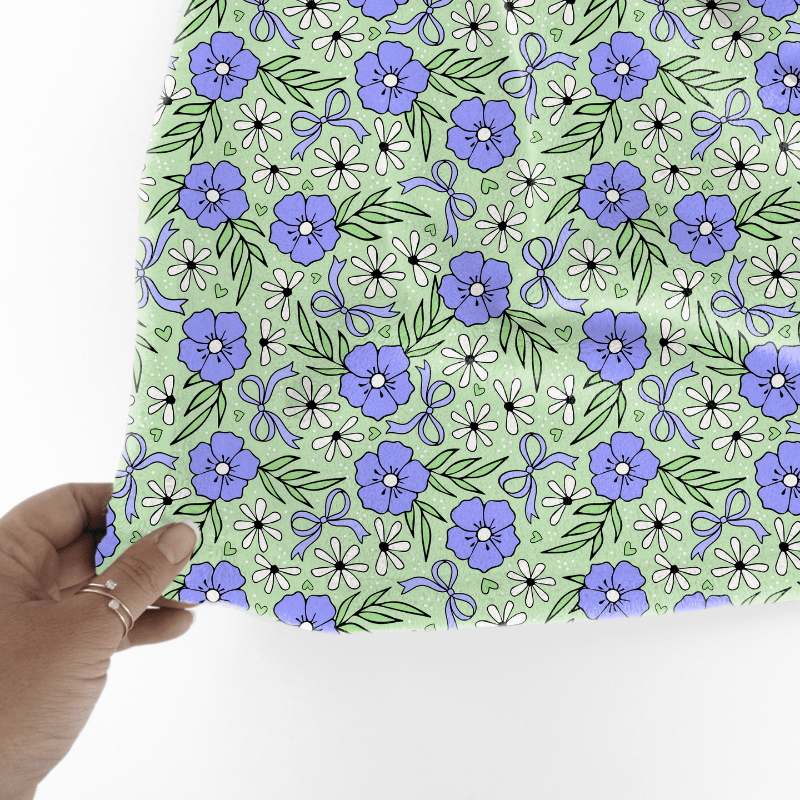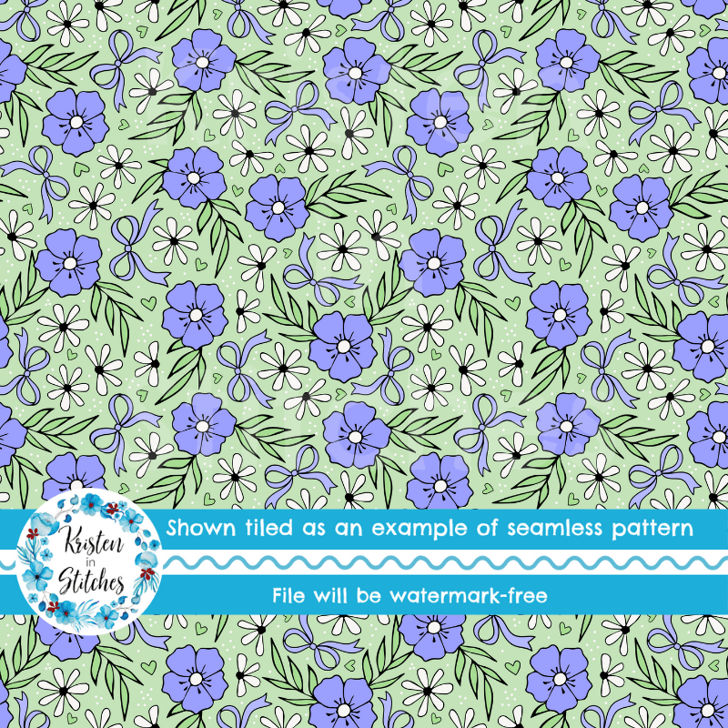 Coquette Wildflower Floral Seamless Pattern, Periwinkle Flower Blossoms on Mint