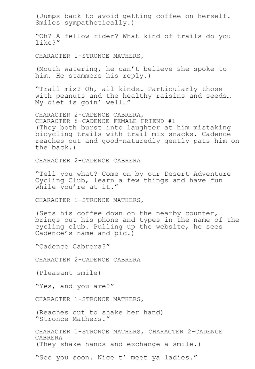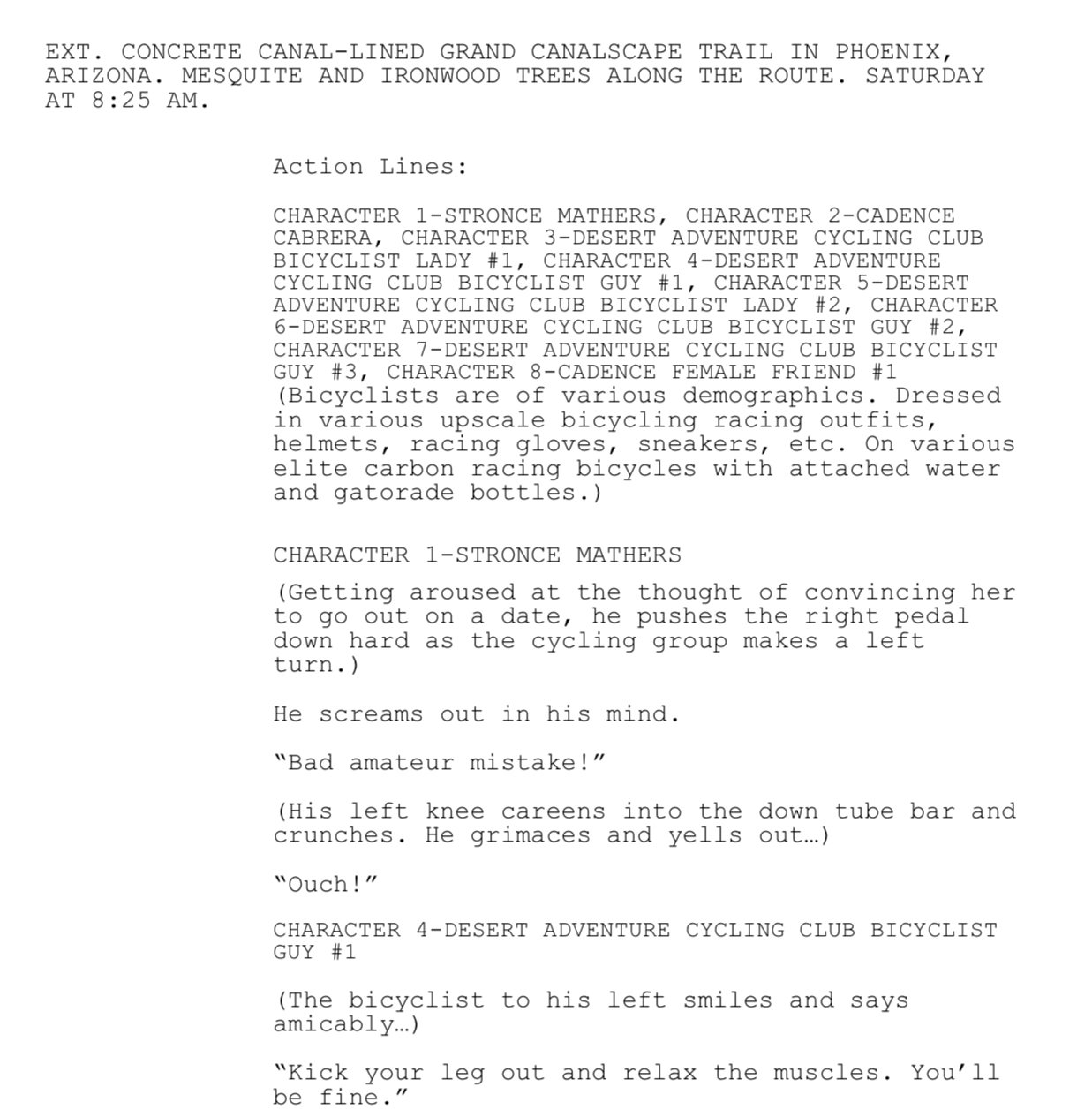 This is Screenplay Part #1 of a Romantic Comedy for all who love action, adventure, and the excitement of bicycling. Stronce Mathers is a meek-mannered chemist who works for a major beauty brand and creates lotions that alleviate all manner of rashes. He uses special jojoba oil from Africa. He sees a beautiful woman bicyclist, and to impress her, he buys an elite racing bike and joins her bicycling club. She gets constant, painful rashes, so he works tirelessly to create a cream for her. Filled with action, emotion, and humor.