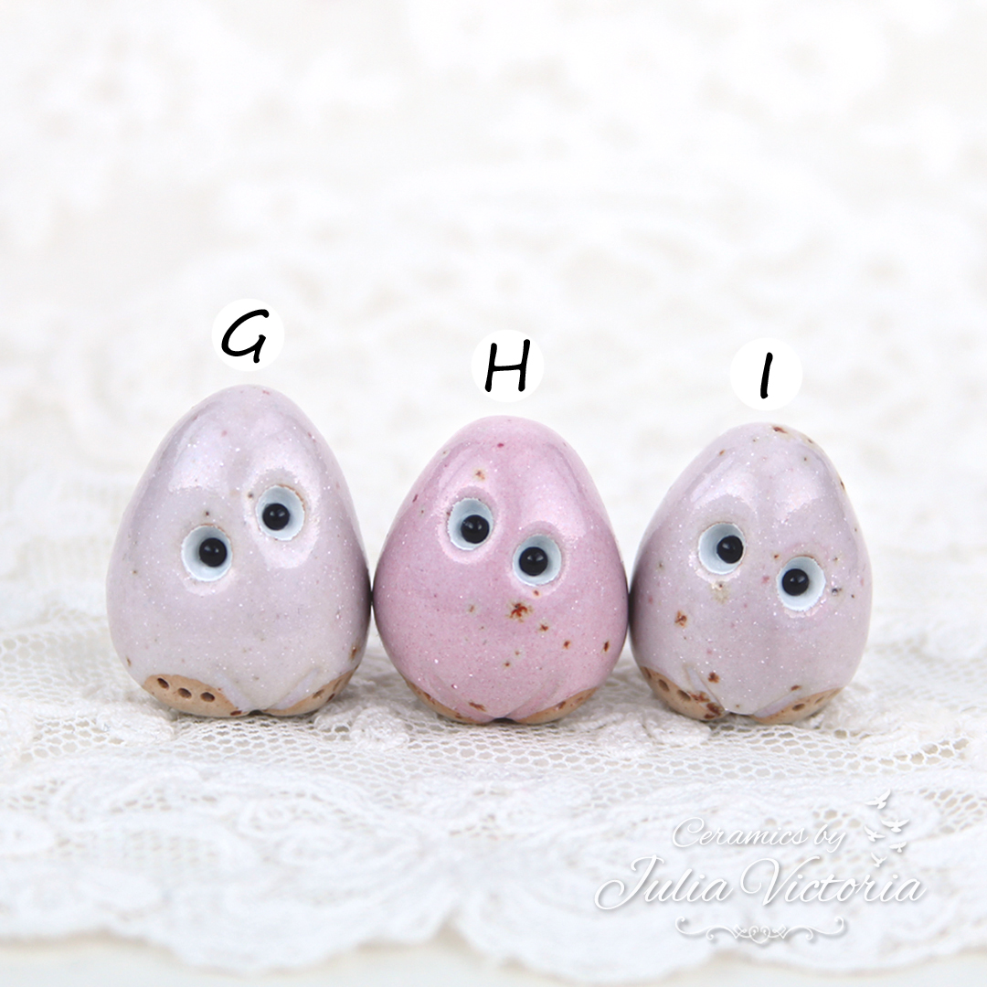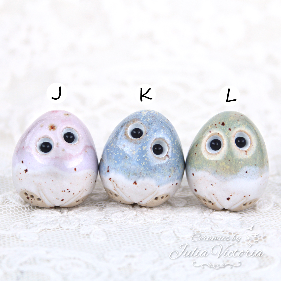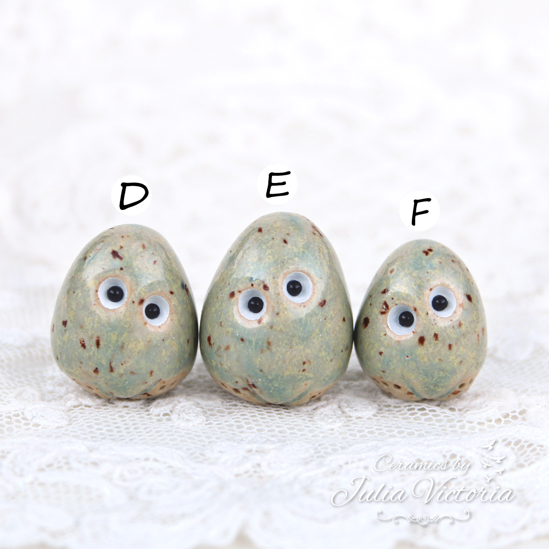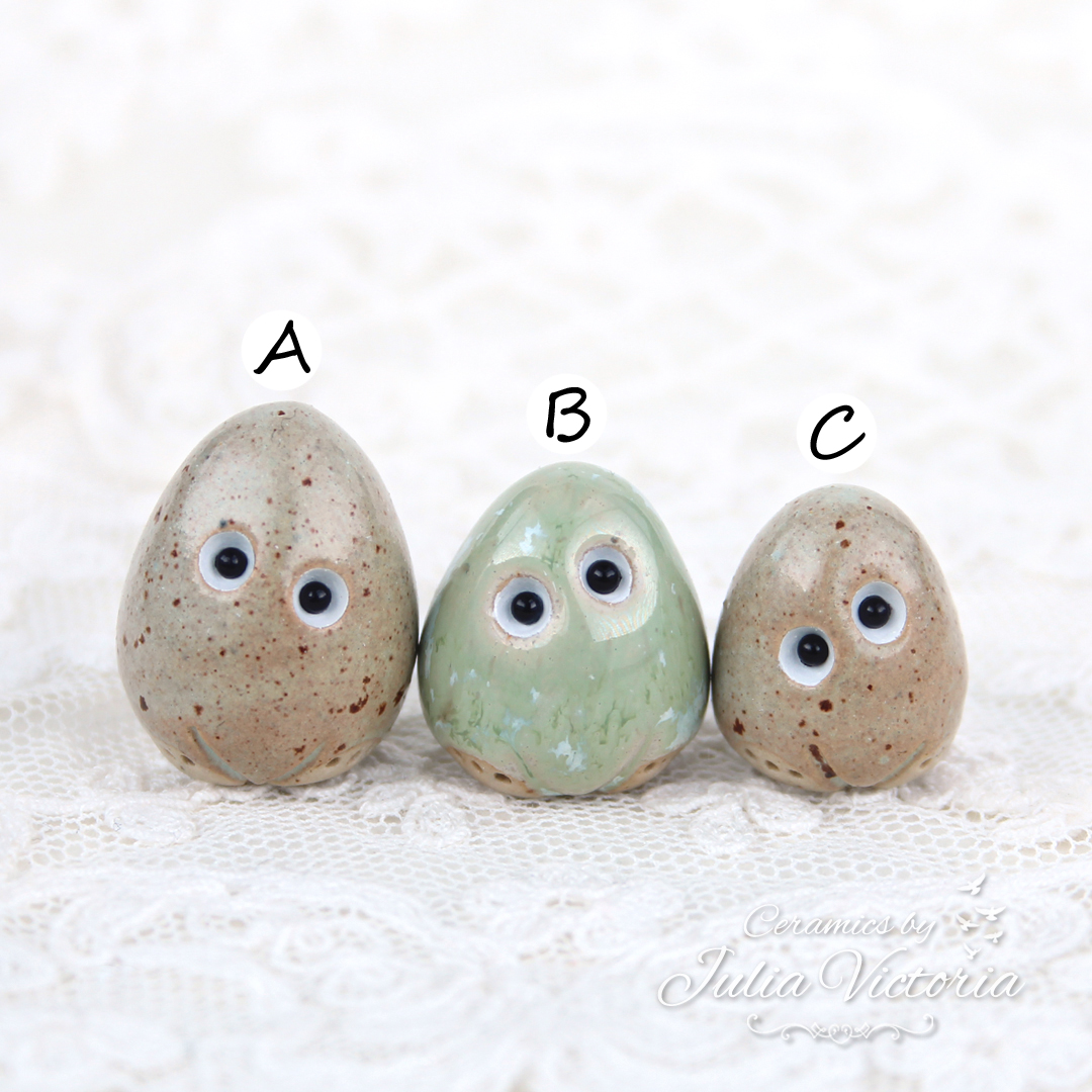 These cute little eggs are looking for a new home. They are hand-sculpted in ceramics, glazed and painted by me