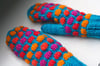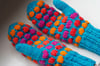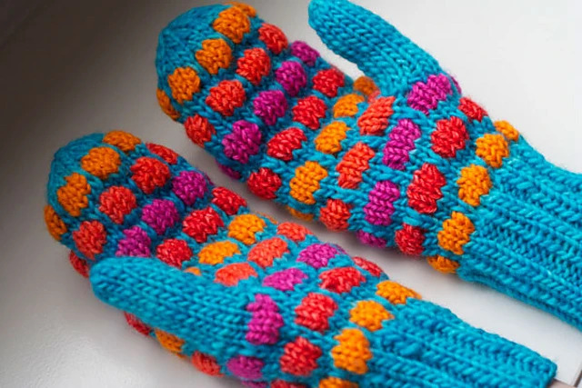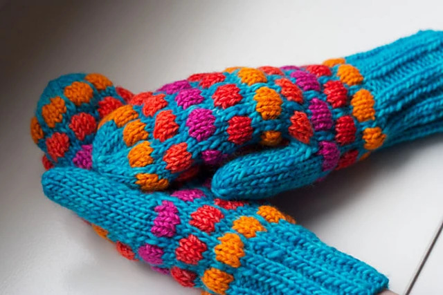 The mittens are worked at a worsted weight gauge. Choose a yarn with some wool content for warmth. The colourful dots are worked holding 2 strands of DK together, but 2 strands of fingering weight or 1 strand of worsted weight could be substituted. This is a great stash buster project to use up all those little remnants.