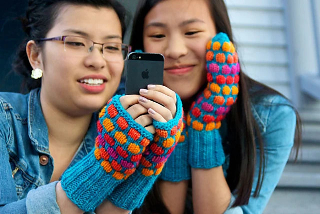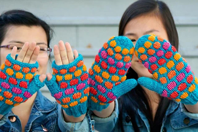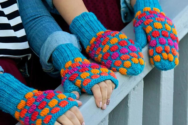Goody, goody gumdrops – the polka dots on these cozy mittens are such fun. Go crazy with colour here and knit every row of gumdrops a different color, or be subtle with tone on tone. There is a size for everyone: babies to grandpas. Instructions for both traditional mittens and fingerless gloves are included.