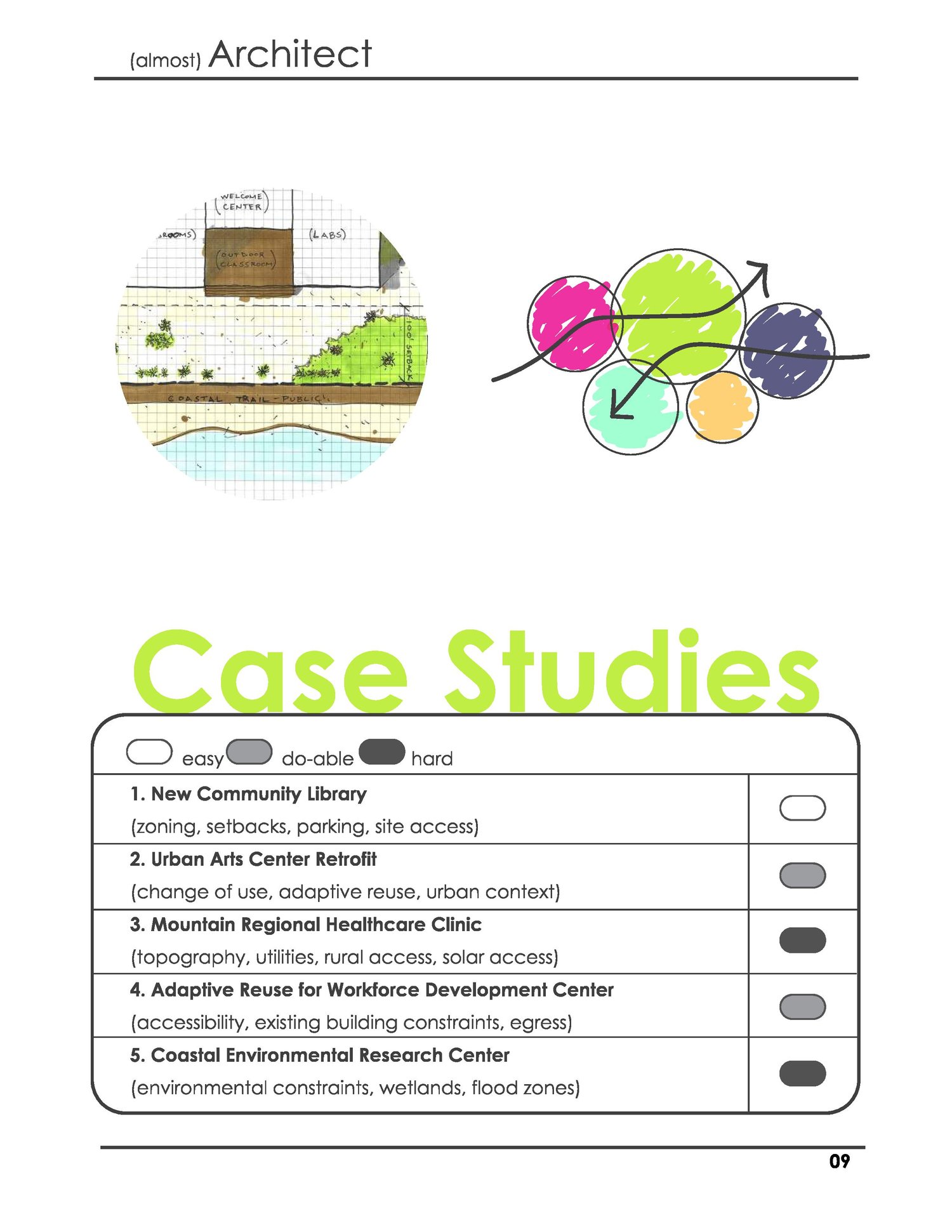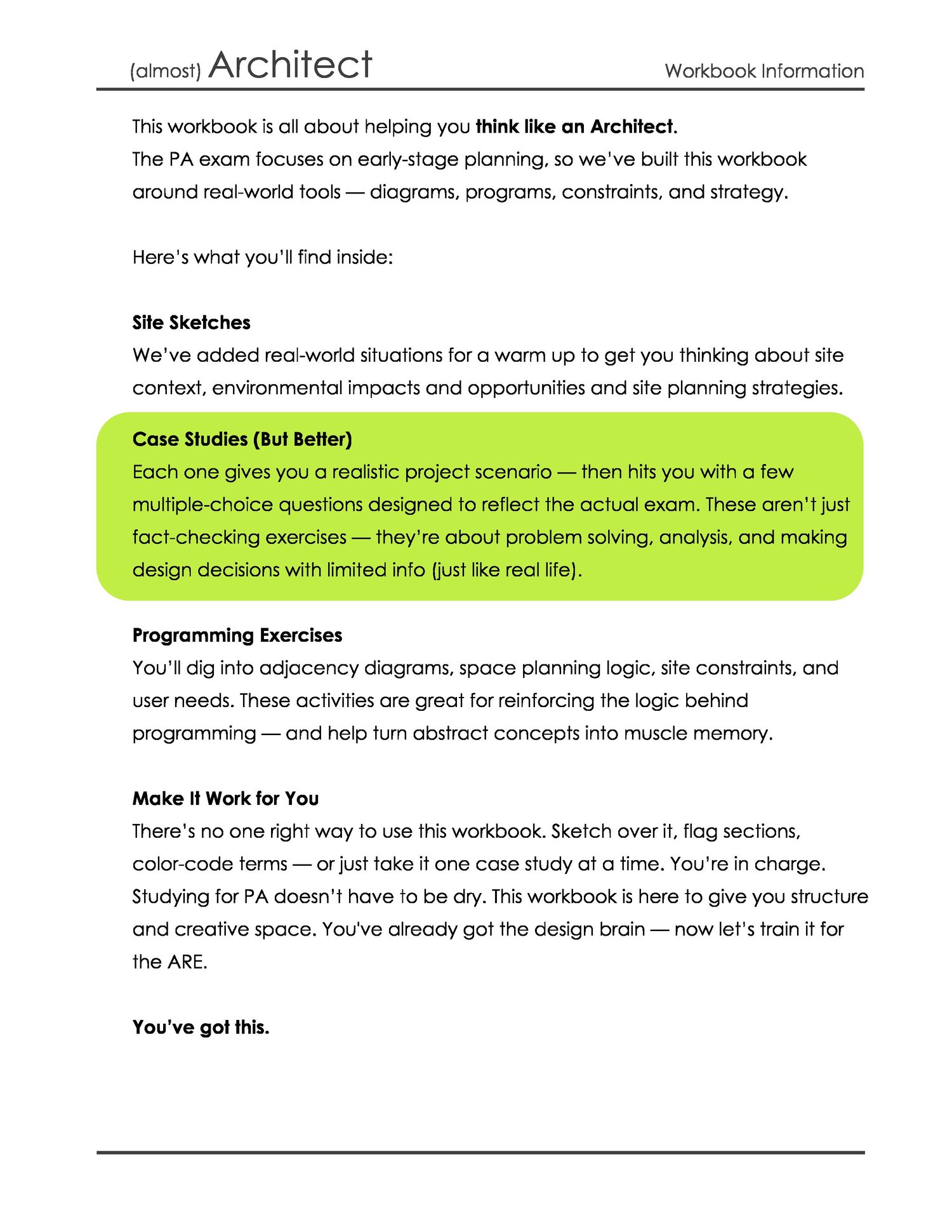 That’s why I created (almost) Architect. I wanted study tools that actually felt helpful — something visual, hands-on, and made by someone who’s been through it, too. These workbooks are packed with real-world-inspired case studies, sketch-based activities, and bite-sized prompts to get you thinking like an architect (not just cramming like a test-taker).