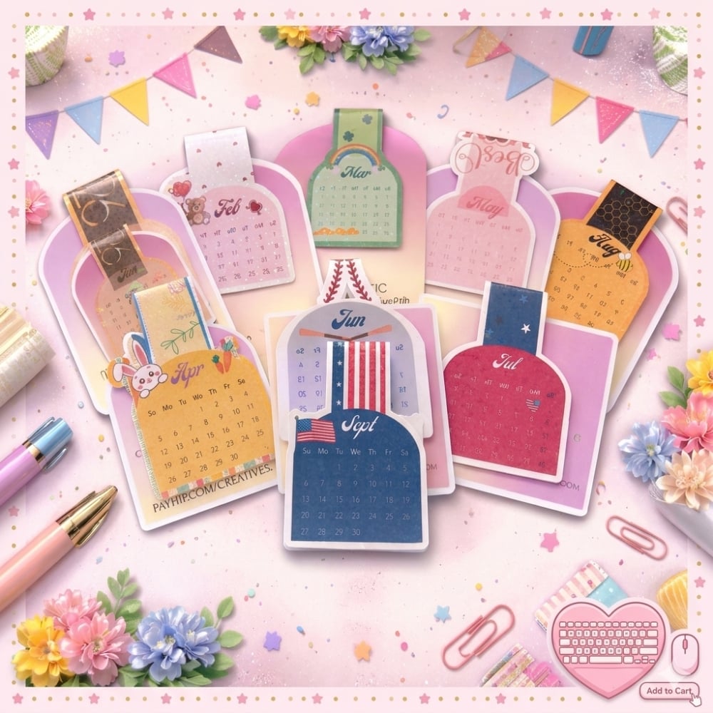 Keep your year organized in the sweetest way with this 12‑piece Monthly Calendar Magnetic Bookmarks Set, designed from January through December. Each bookmark features its own mini monthly calendar paired with a fun, themed illustration that brings a little joy to every page you mark.