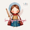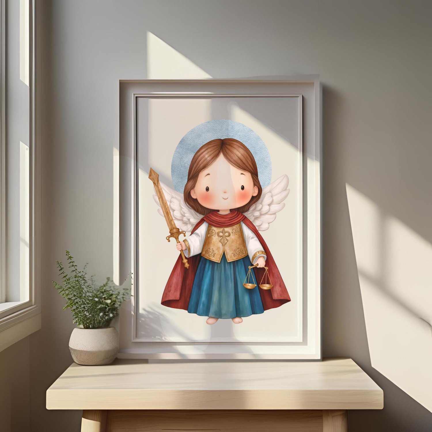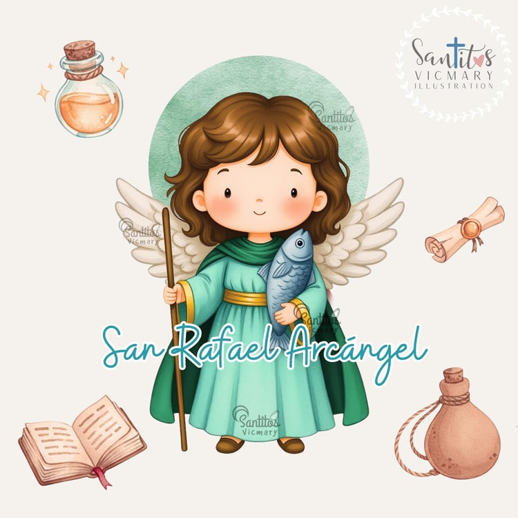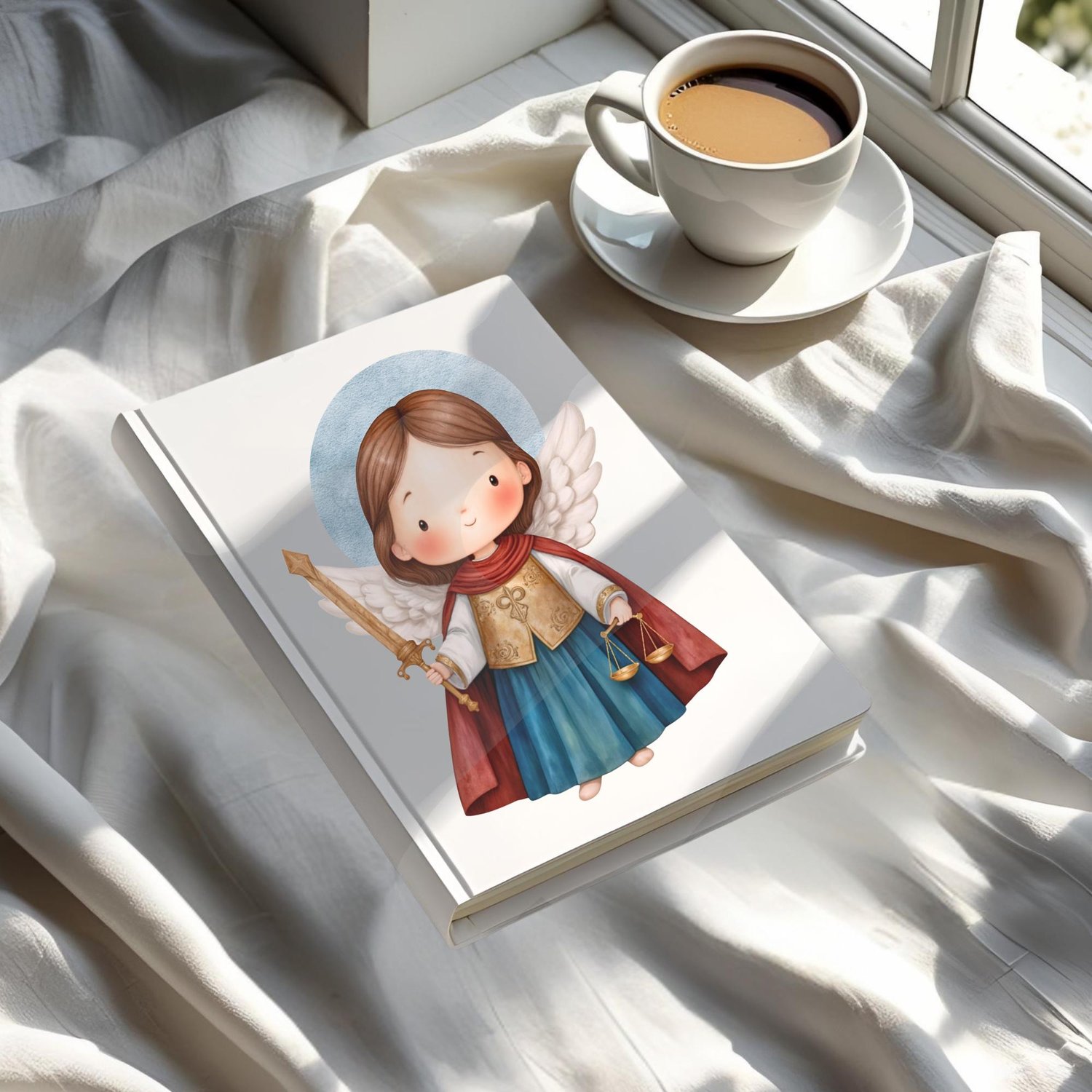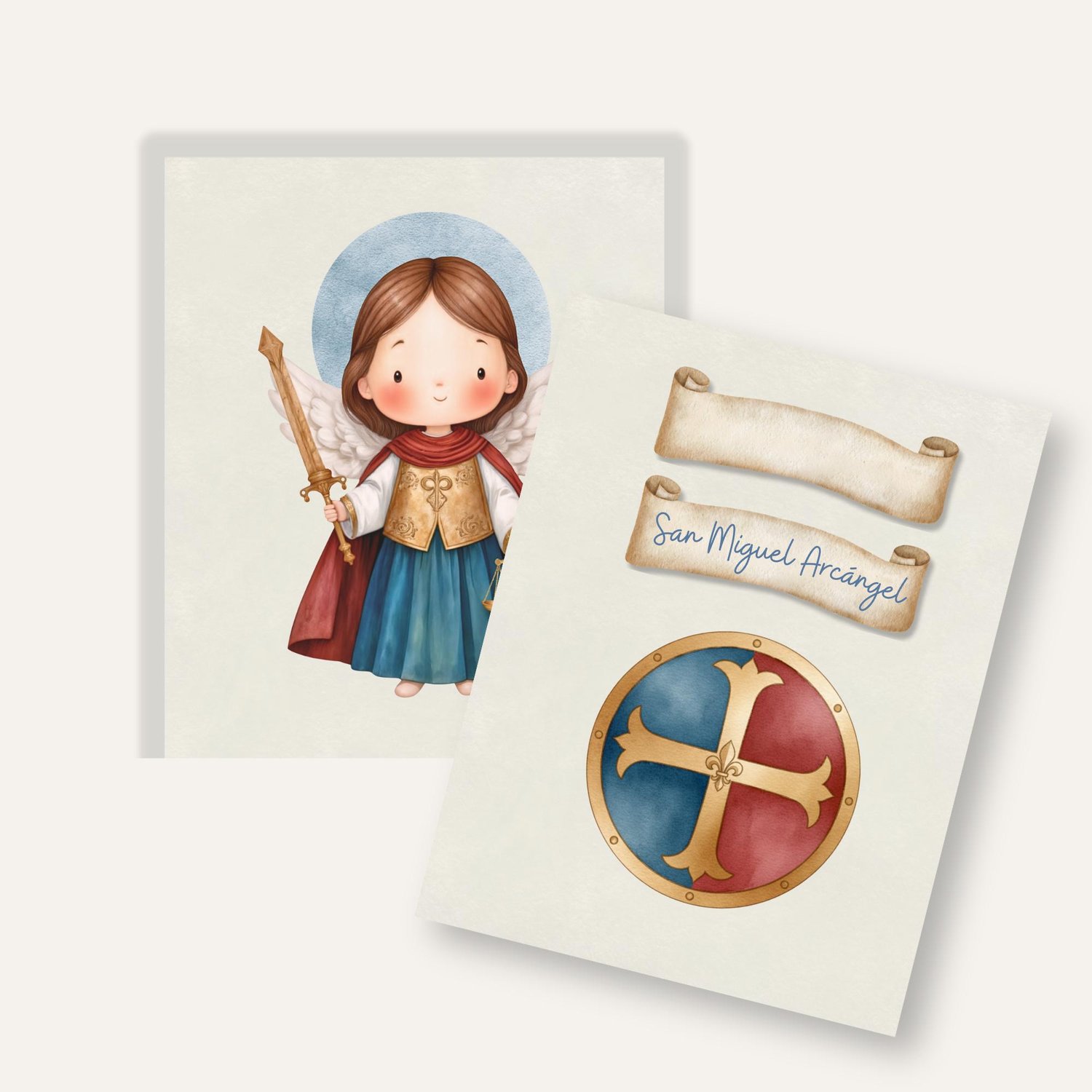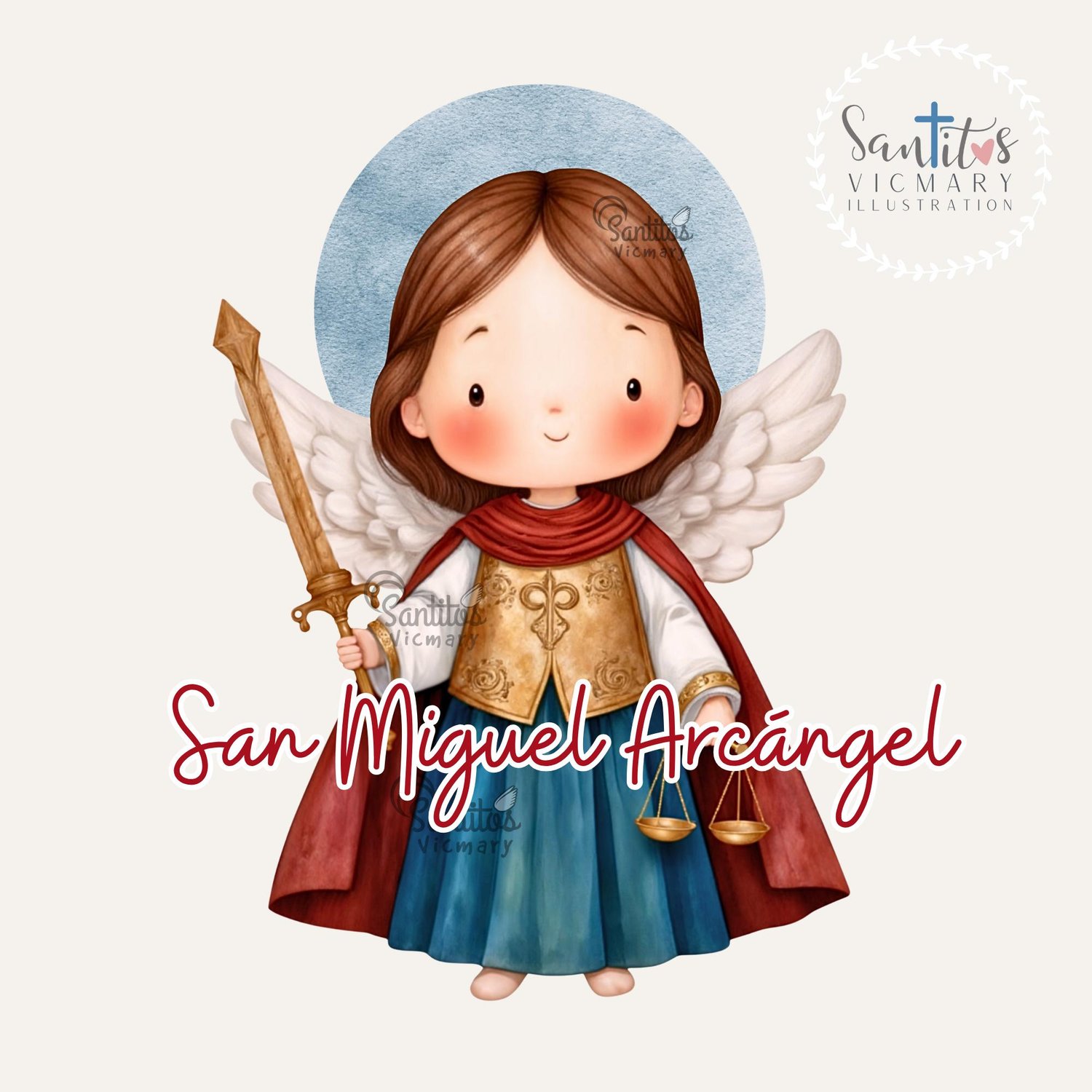 1x Ilustración principal de San Miguel Arcángel: La imagen del santo con su espada y balanza, en un estilo dulce y moderno. Ideal para estampitas, oraciones, recordatorios y más.