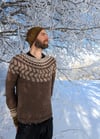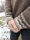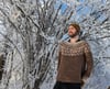 This is a pattern for a circular yoked top-down sweater, intended for a more usual man’s body shape (but a lovely knit-able sweater for all with a few notes for knitters who prefer more shaping). It uses the stranded colorwork technique in a toast to the delightfully appealing evergreen. Both festive and outdoorsy, a warm jumper for inside or out!