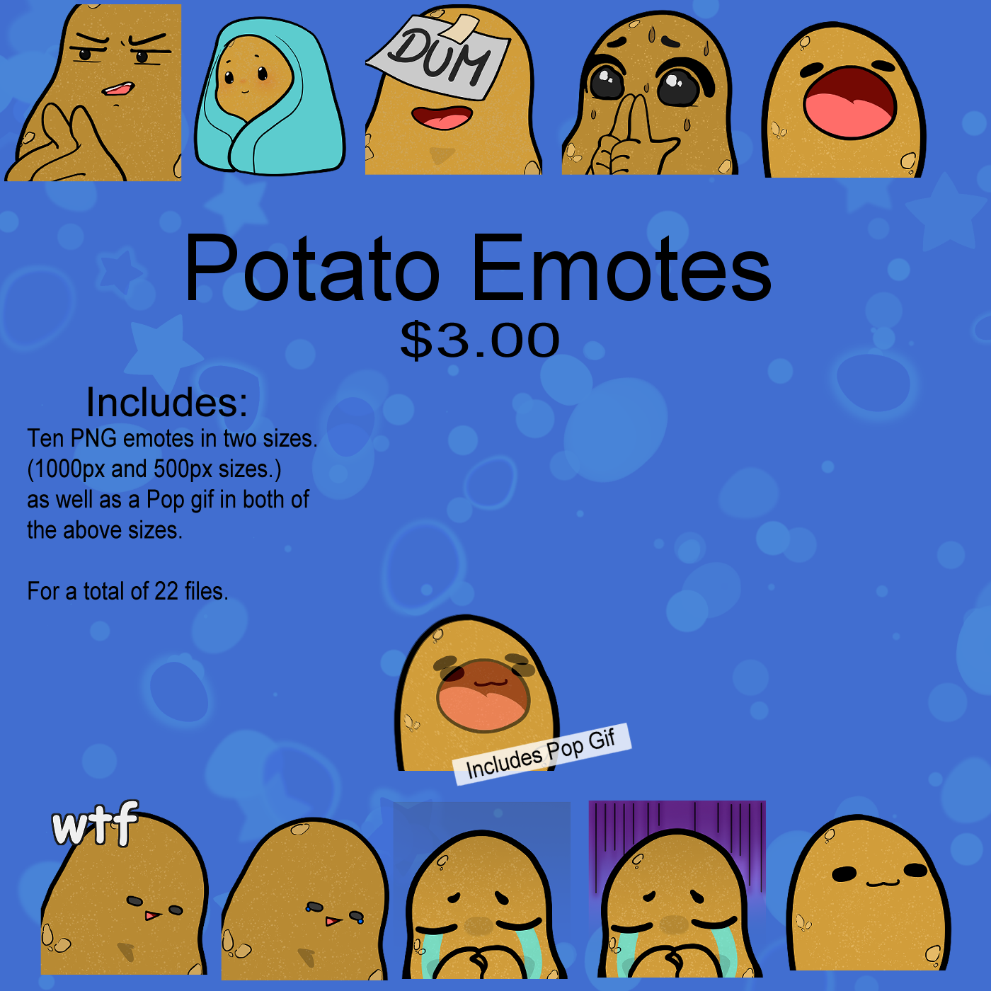 This contains Emotes of a Generic Potato Design, and can be used in places such as Discord or Twitch. They come in Blank size by Blank size at 300dpi, as well as blank size by blank size, also in 300dpi. They may need to have their size modified in some cases to work with specific content or on specific sites.