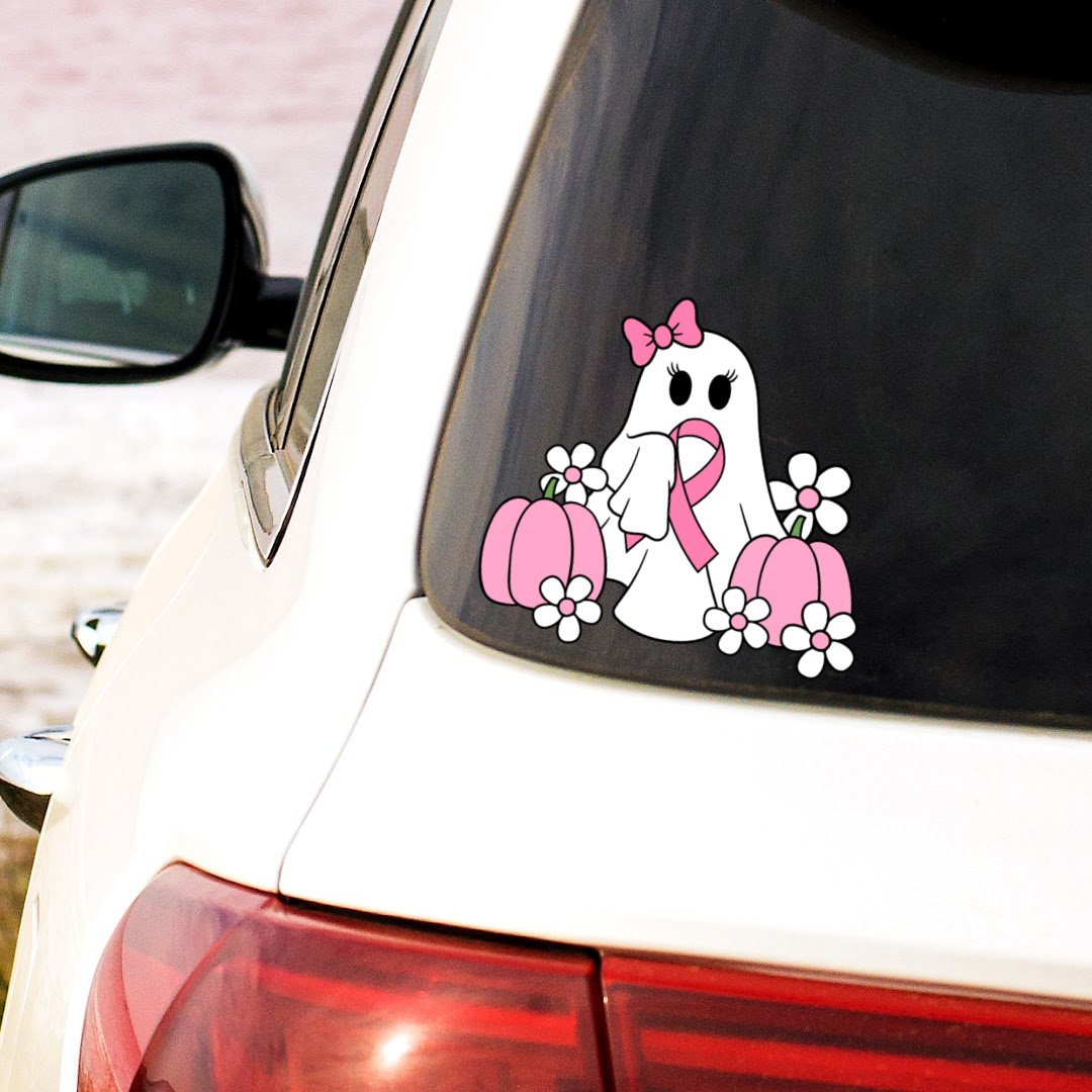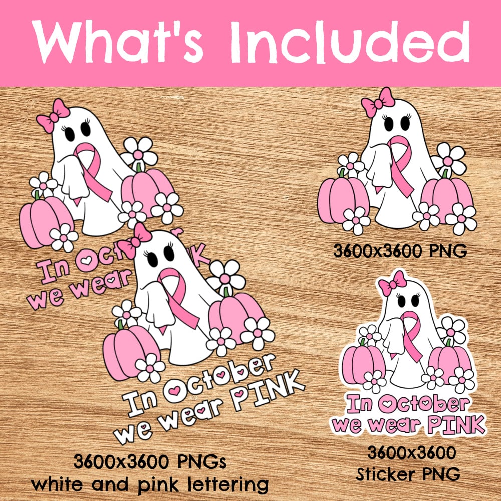 Cutesy ghosts with a pink bow and awareness ribbon, pumpkins and daisy flowers. Print and cut your own stickers, or use for uv dtf transfers, shirts, digital journals and so much more!