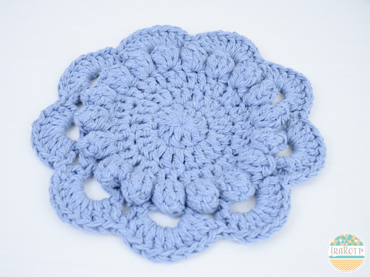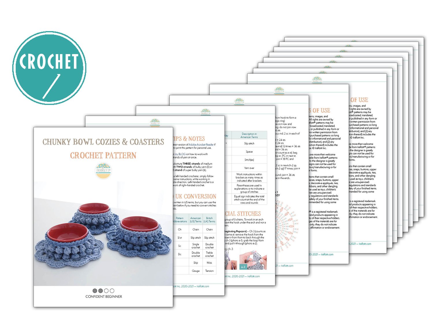 Make a chunky bowl cozy to protect your fingers from a hot bowl when you carry it and keep your delicious meal warm while you enjoy it. A matching coaster will dress up and protect your table. This pattern is written row-by-row using US crochet terms, along with crochet diagrams, step-by-step photos, and a conversion chart to UK terms.
