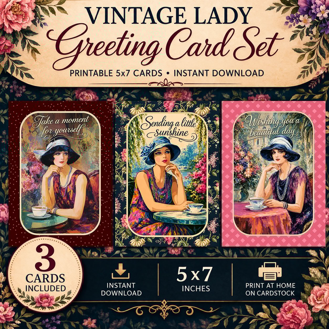 Printable Vintage Lady Greeting Cards Set – Floral 5x7 Cards Instant Download