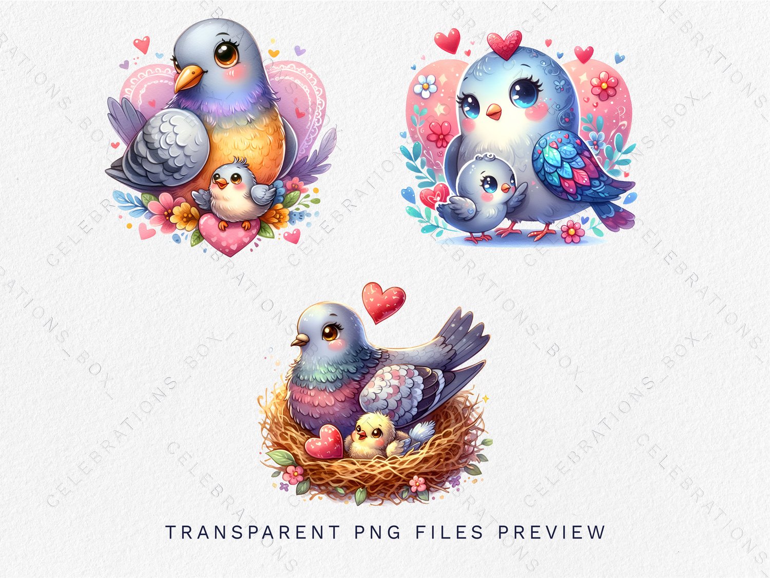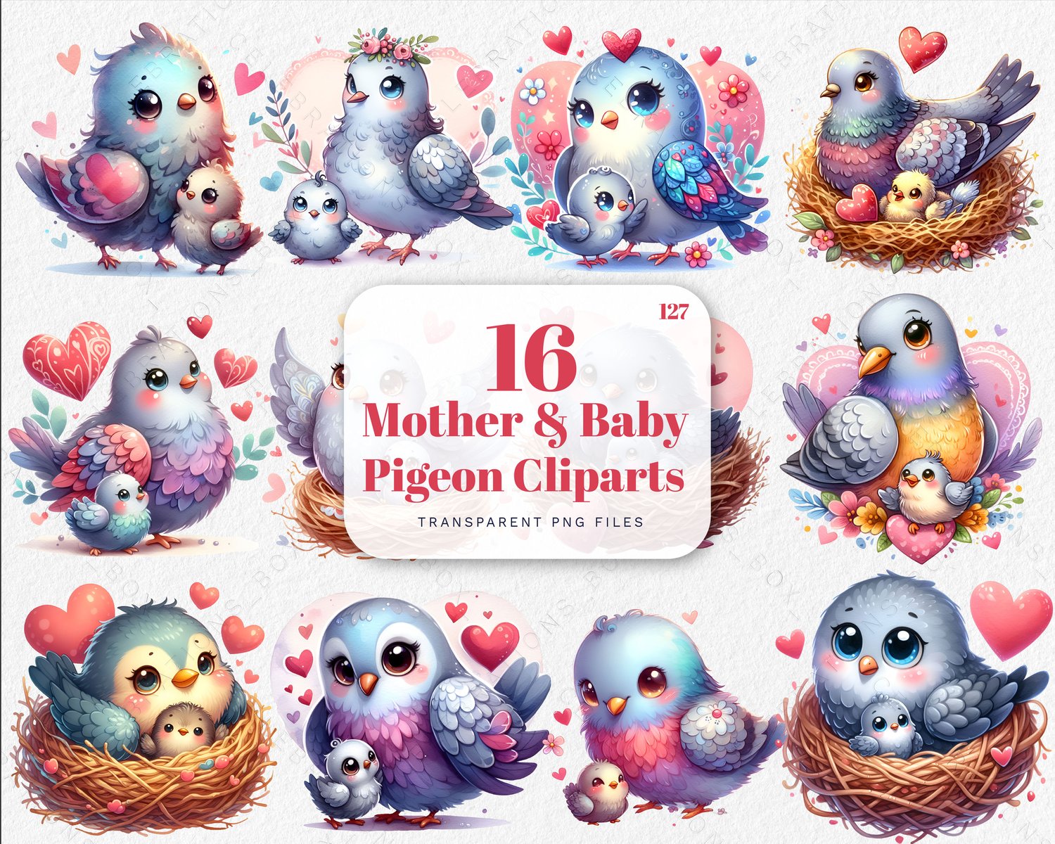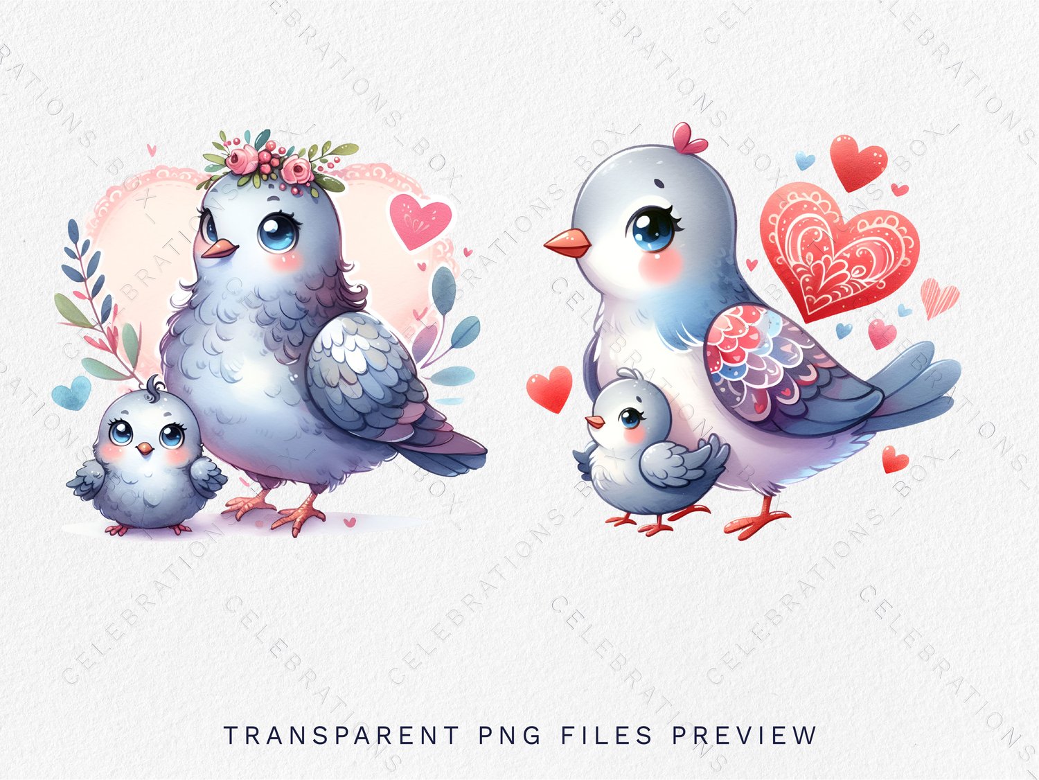 Watercolor Pigeon Mom And Baby Clipart Bundle