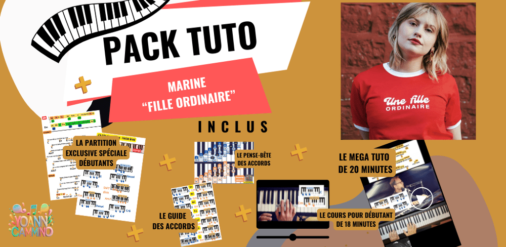 PACK TUTO : "Fille ordinaire" de Marine : partition exclusive + vidéo du Tuto de 20 minutes + cours vidéo débutant + guide des accords + pense-bête des accords