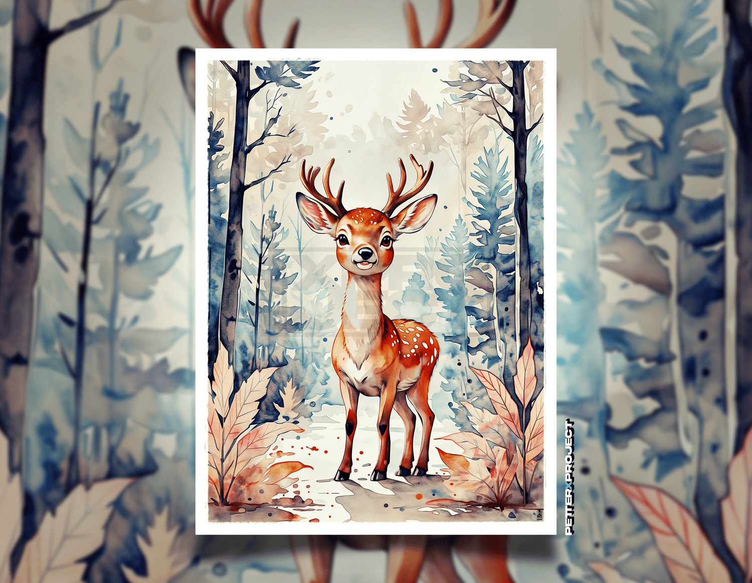✦ Encantadora ilustración en acuarela de un joven ciervo en un bosque sereno, con colores suaves y expresión delicada, ideal para decoración infantil y ambientes inspirados en la naturaleza.