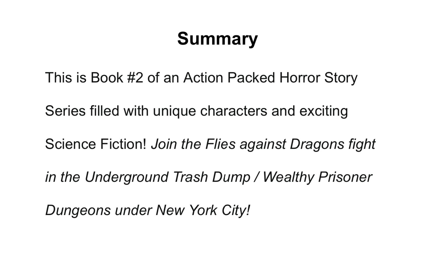 This is Book #2 of an Action Packed Horror Story Series filled with unique characters and exciting Science Fiction! Join the Flies against Dragons fight in the Underground Trash Dump / Wealthy Prisoner Dungeons under New York City!
