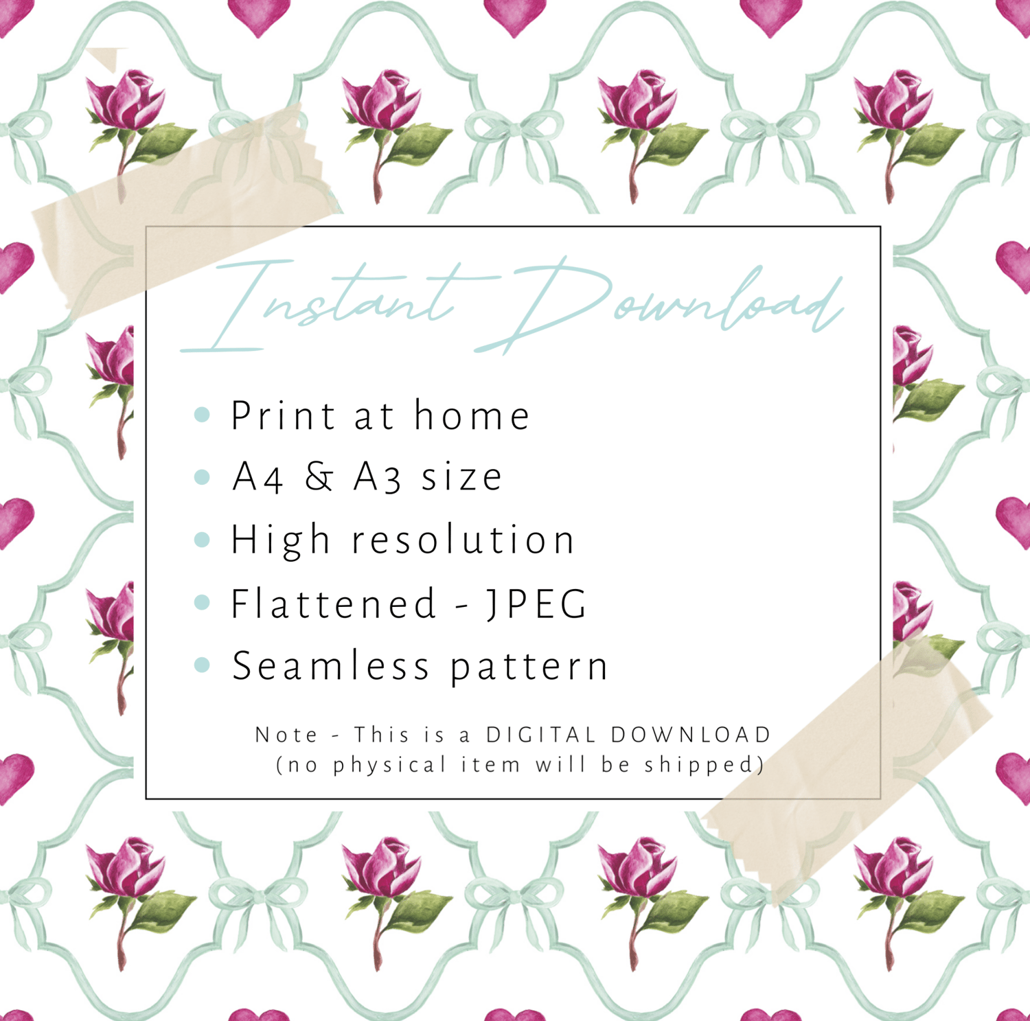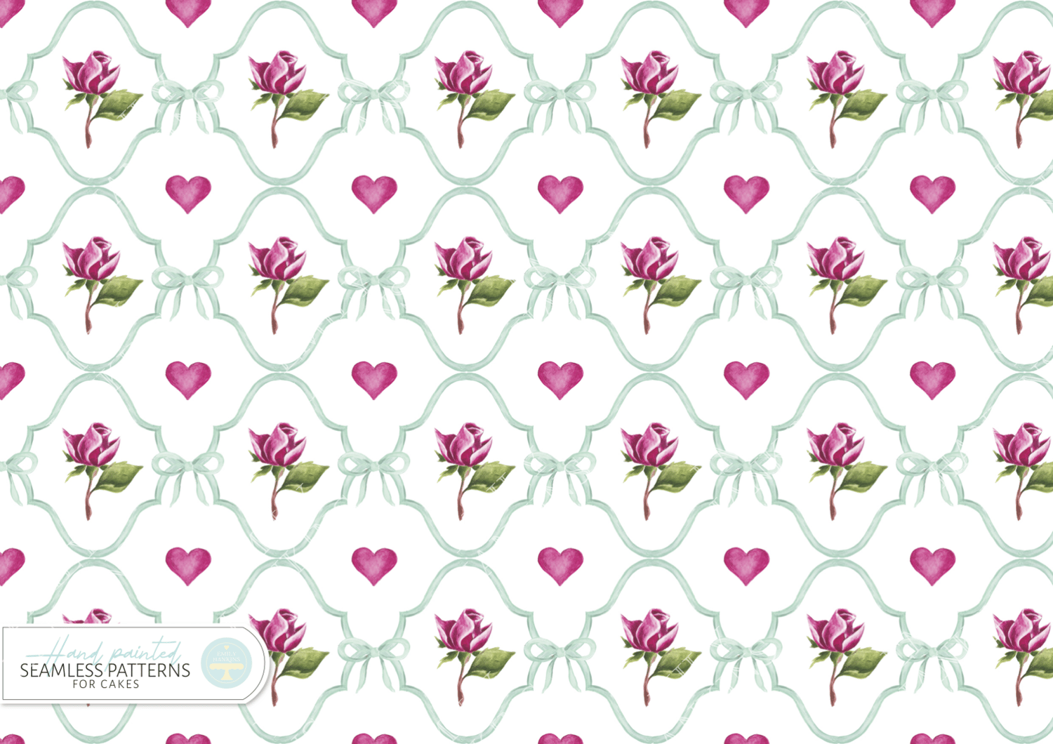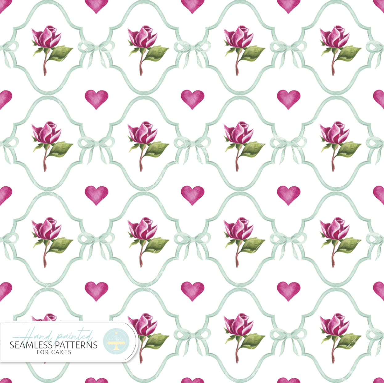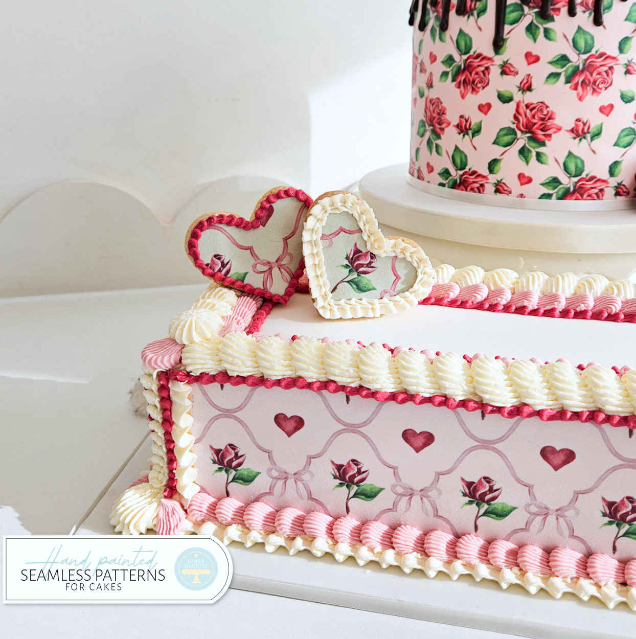 The design is inspired by romance - something we all need a little bit of in our lives! It features rose buds and hearts within a trellis design on a white background. Each flower and design element has been hand painted by Emily and painstakingly crafted into a seamless pattern for your cake designs.