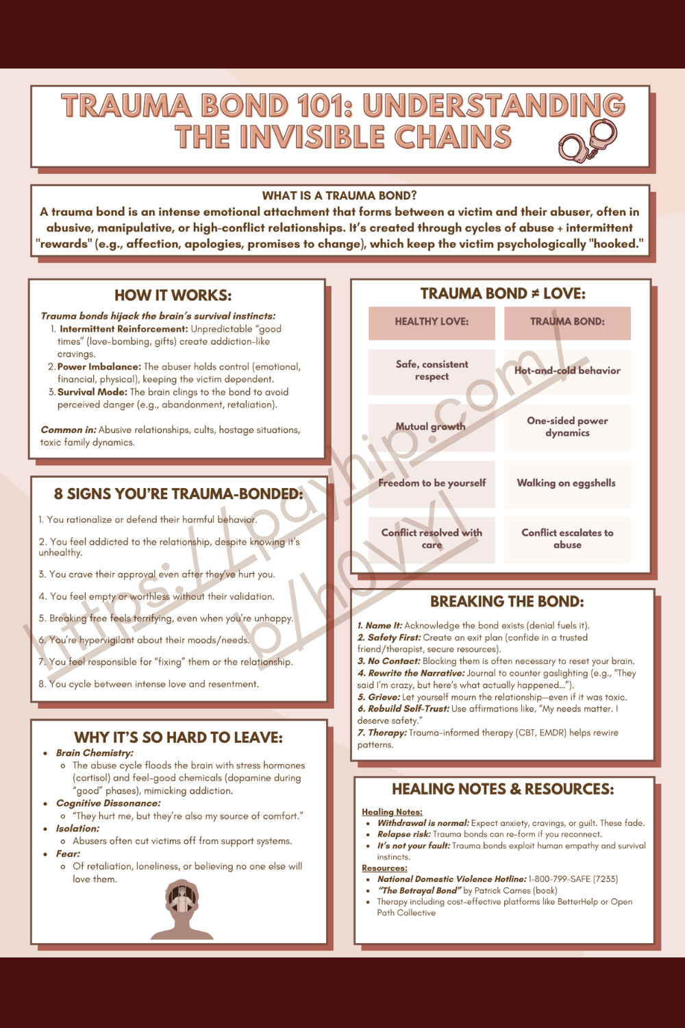 This worksheet gives a 101 overview on trauma bonds. A trauma bond is an intense emotional attachment that forms between a victim and their abuser, often in abusive, manipulative, or high-conflict relationships. It’s created through cycles of abuse + intermittent "rewards" (e.g., affection, apologies, promises to change), which keep the victim psychologically "hooked."