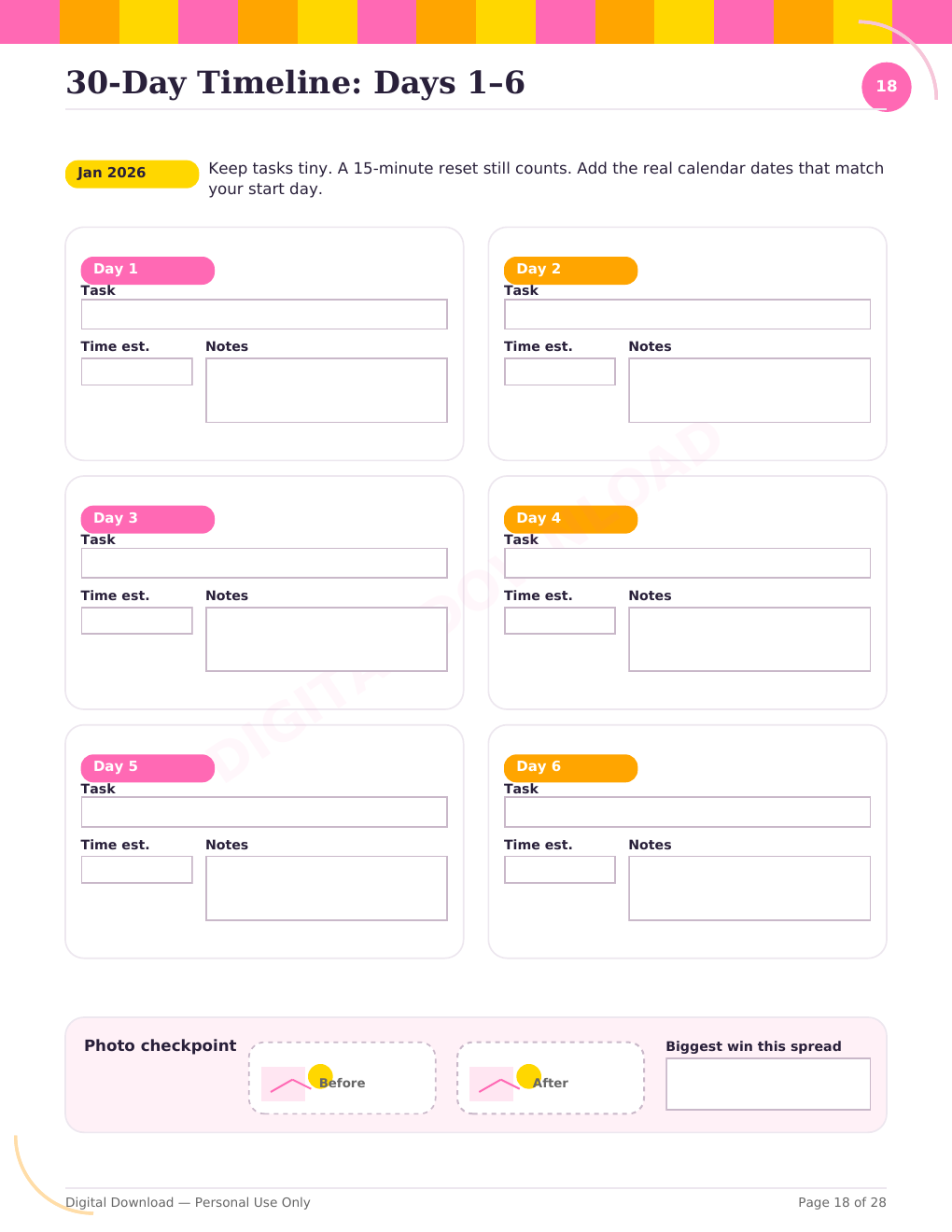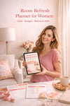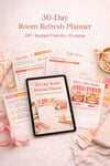 This 30-Day Room Refresh Planner for Women is a playful, practical printable workbook designed to help you transform one room at a time — without overwhelm, without perfection, and without spending a fortune.
