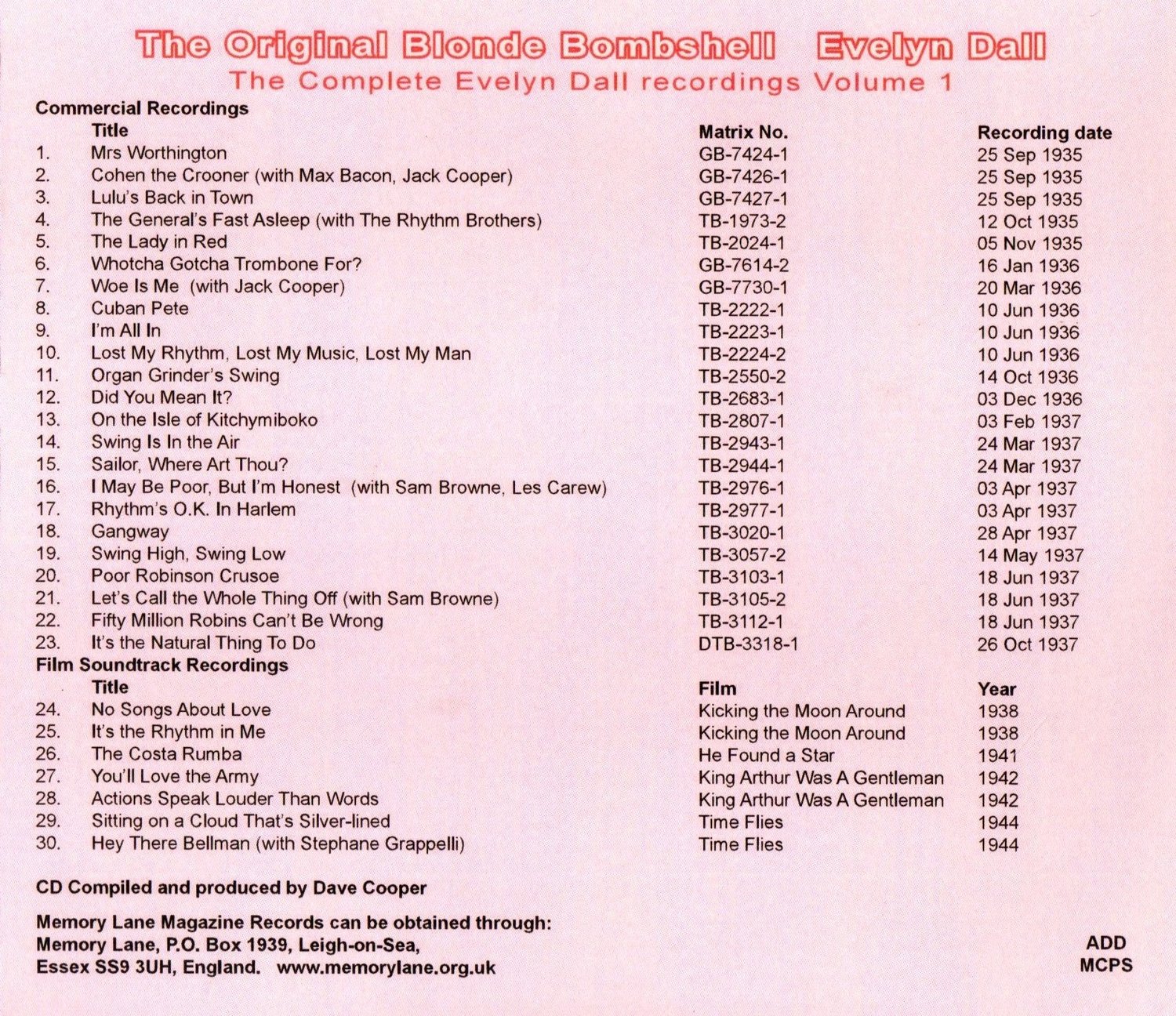 Here is the first CD totally devoted to Evelyn Dall, the Original Blonde Bombshell. No less than 30 of her recordings. These are taken from her 78rpm records with Ambrose and his orchestra including, no less than seven performances taken from her film appearances.