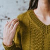 Stella, by Oregon-based designer Jennifer Parroccini, presents a stunning mock cable pullover featuring a clever cross stitch pattern running up the front and around the back hem. This simple stitch pattern is quick to memorize, resulting in a beautiful pullover to pair with jeans, skirt, or over a dress this fall. This pullover is made from the bottom up in pieces and seamed. The neckline is picked up after seaming and worked in the round.