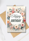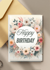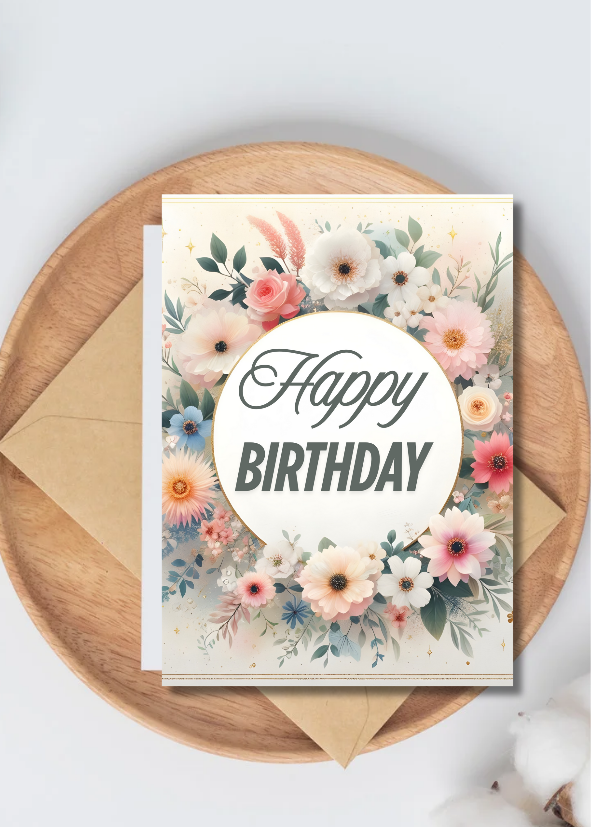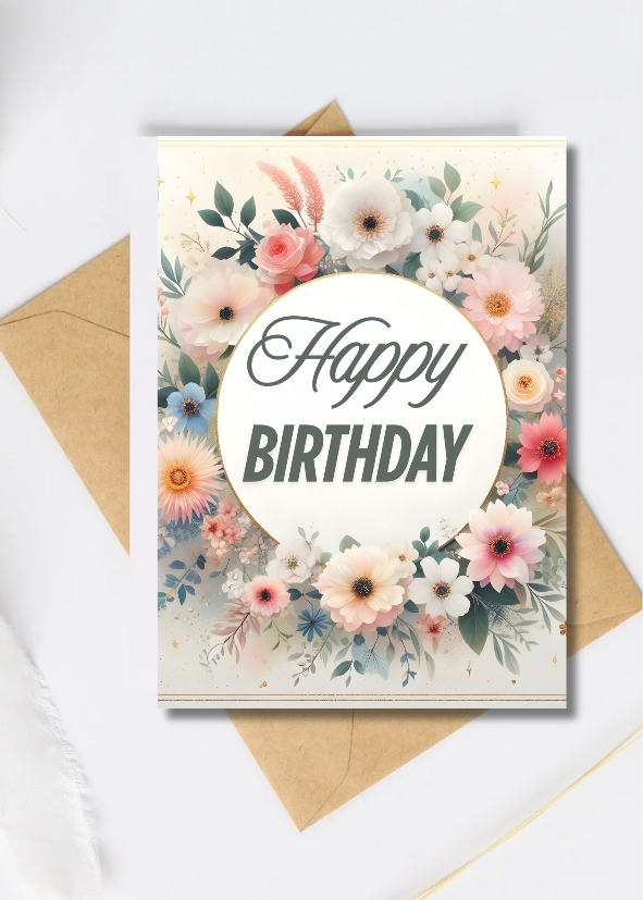 Celebrate any special occasion with this exquisitely designed 'Happy Birthday' card! This elegant card features a stunning array of delicate pastel flowers in soft shades of pink, white, blue, and peach, creating a serene and sophisticated aesthetic. The central 'Happy Birthday' message is framed within a beautiful white circle, surrounded by the enchanting floral arrangement and subtle golden glitter accents for a touch of sparkle.