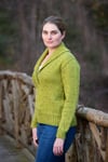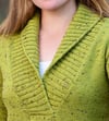 Bozeman is worked from the top down, beginning at the back shoulders. The back is worked to the armholes, then placed on hold while each side of the front is picked up from the back shoulders and worked to the armholes. Then the back and front are joined and the body is worked back and forth until the neck shaping is completed. Stitches are cast on for the center front neck, the fronts are joined, and the body is worked in the round to the bottom edge. The sleeves are picked up from the armholes and worked to the cuffs, with short-row shaping to shape the sleeve caps. Stitches for the shawl collar are picked up around the neck edge and the collar is shaped using short rows. The collar is finished with an i-cord bind-off.