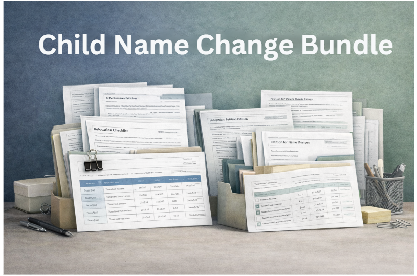 Changing a child's name through the court requires more paperwork than most parents expect — especially when the other parent is absent or objects. The Child Name Change Bundle gives you every document for the complete process, including templates for serving an absent parent and handling a contested name change hearing.