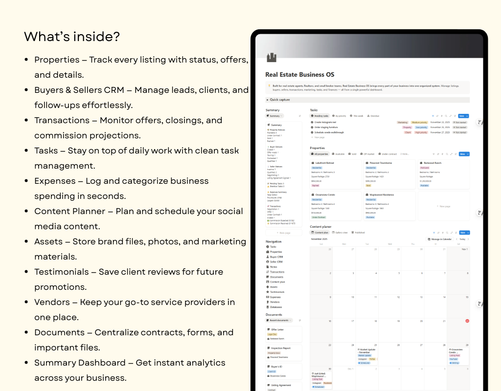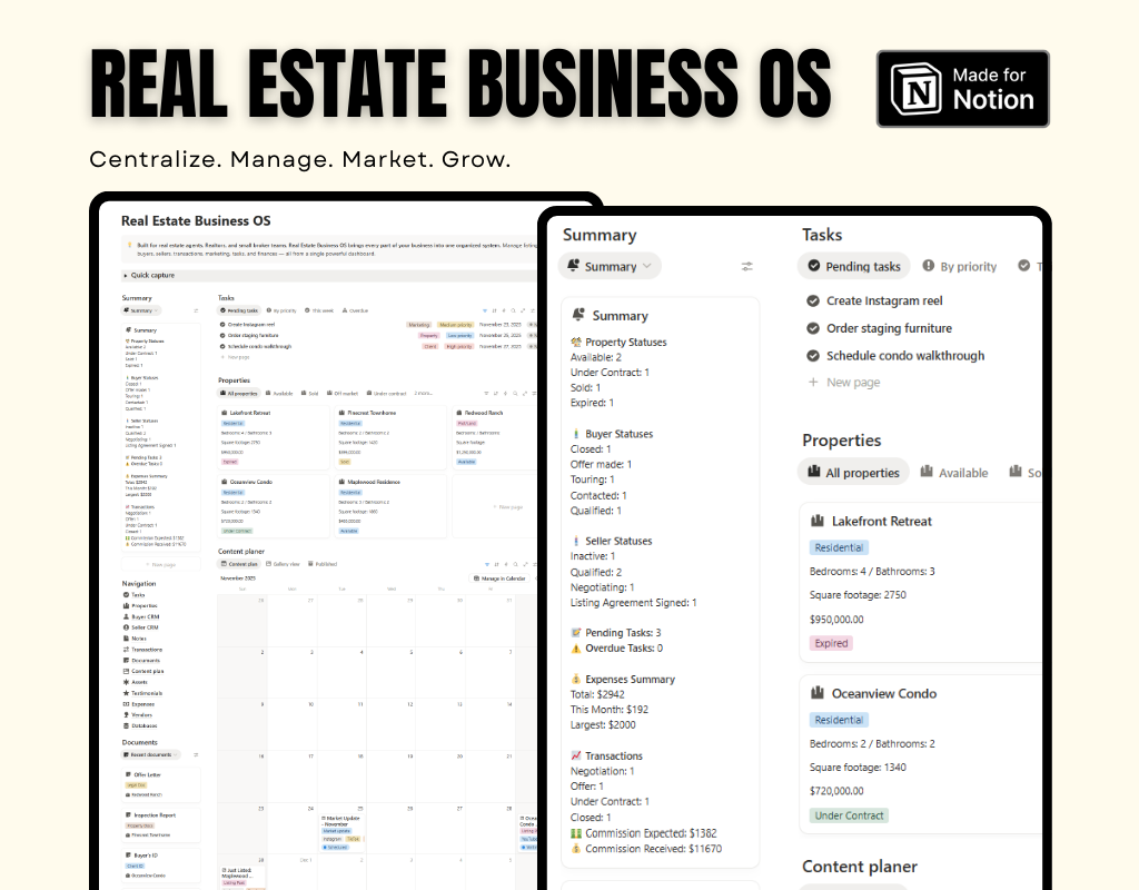 Real Estate Business OS is a complete, streamlined Notion workspace designed to help real estate professionals manage their entire business in one place. From listings and clients to tasks, marketing, expenses, and transactions—everything is organized into a connected system that gives you clarity, structure, and full control over your daily operations.